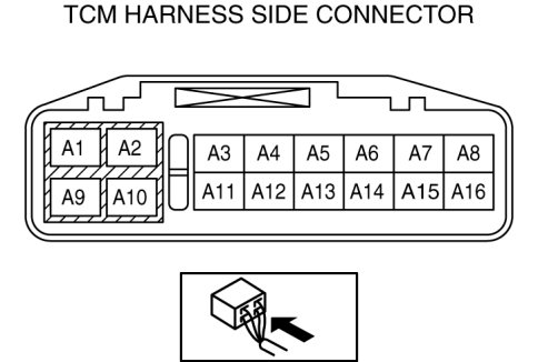 - Use the ground of terminal A9 of the TCM connector (wiring harness-side) when measuring terminal voltage, as an error may occur when connecting the negative circuit tester to ground.