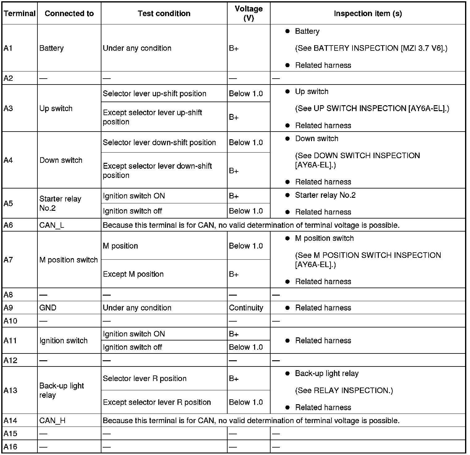 - If any incorrect voltage is detected, inspect the related system(s), wiring harnesses and connector(s) referring to the "Inspection Item" column in the "TCM Terminal Voltage".