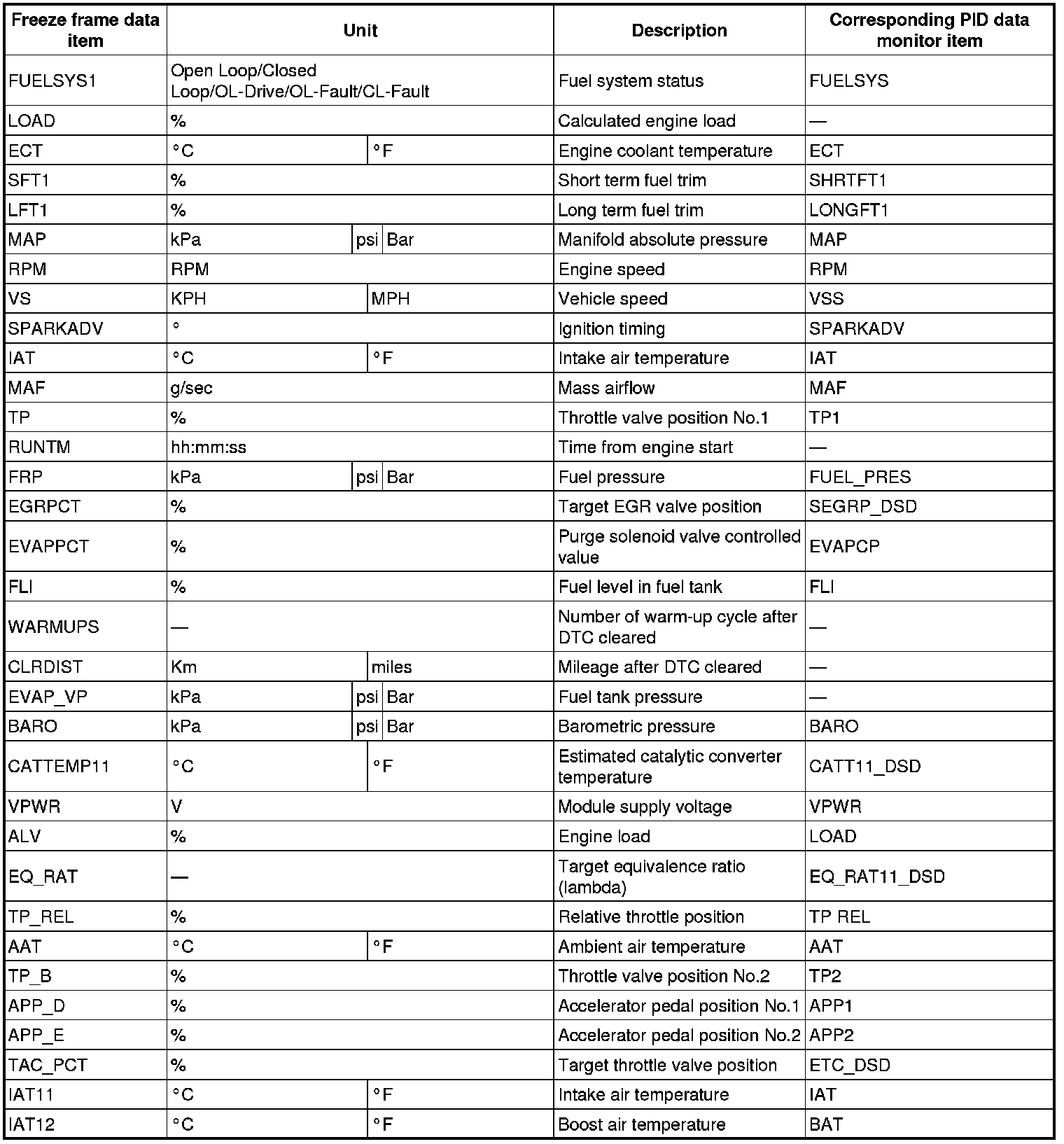 - For the freeze frame data, if there are several malfunctions in the engine control system, the data for the malfunction which occurred initially is stored. Thereafter, if a misfire or fuel injection control malfunction occurs, data from the misfire or fuel injection control malfunction is written over the initially stored data. However, if the initially stored freeze frame data is a misfire or fuel injection control malfunction, it is not overwritten.