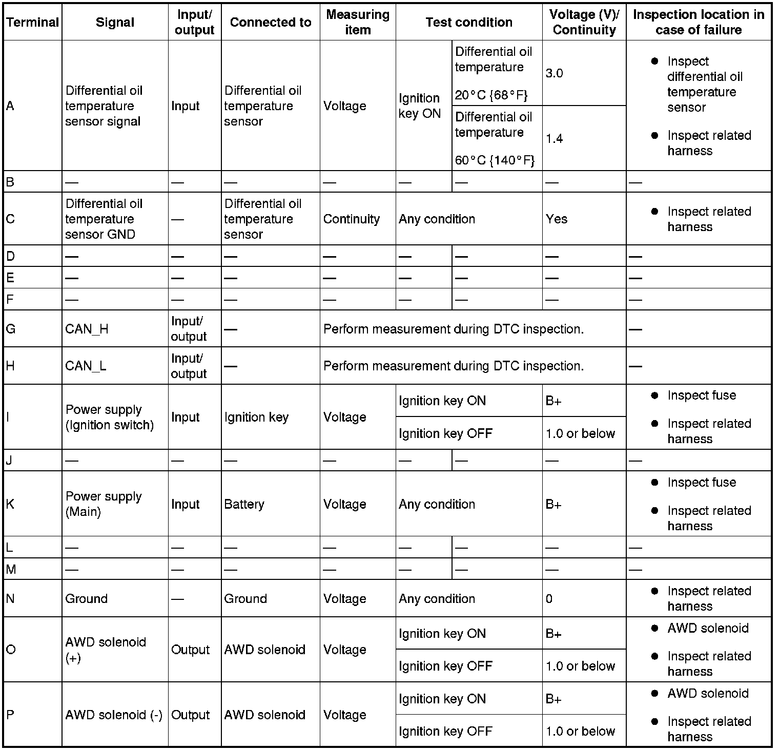 - AWD CM terminal voltage can vary depending on measuring conditions and vehicle aging, resulting in misdiagnosis. Therefore, it is necessary to perform an overall inspection of the input/output systems and AWD CM to determine which part is malfunctioning.