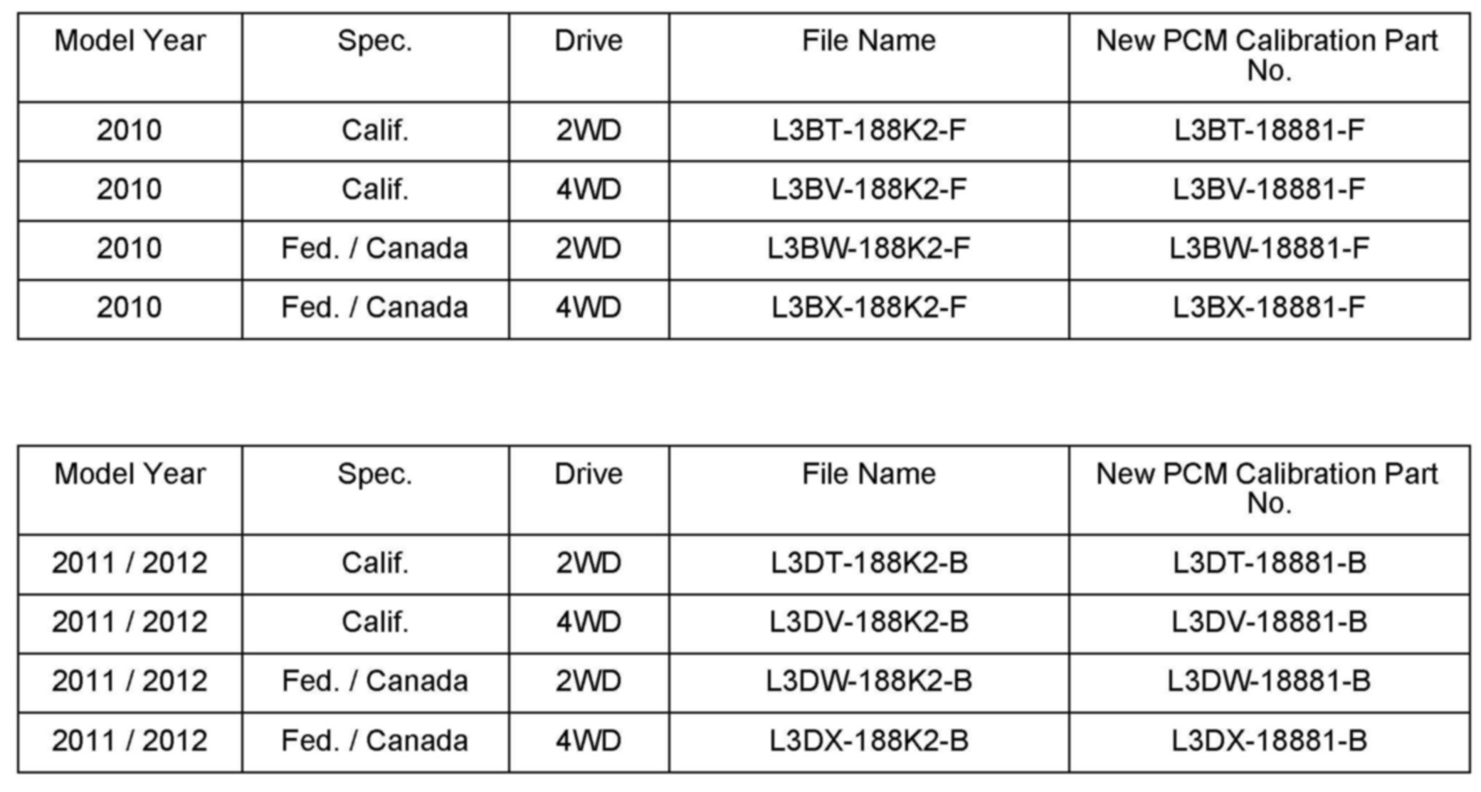 The new PCM Calibration Part Numbers listed above are provided for PCM reprogramming purposes only. These are not necessarily the same Mazda part numbers used to order an actual PCM through the Mazda Parts System. It is not necessary to order a PCM as part of this repair procedure.