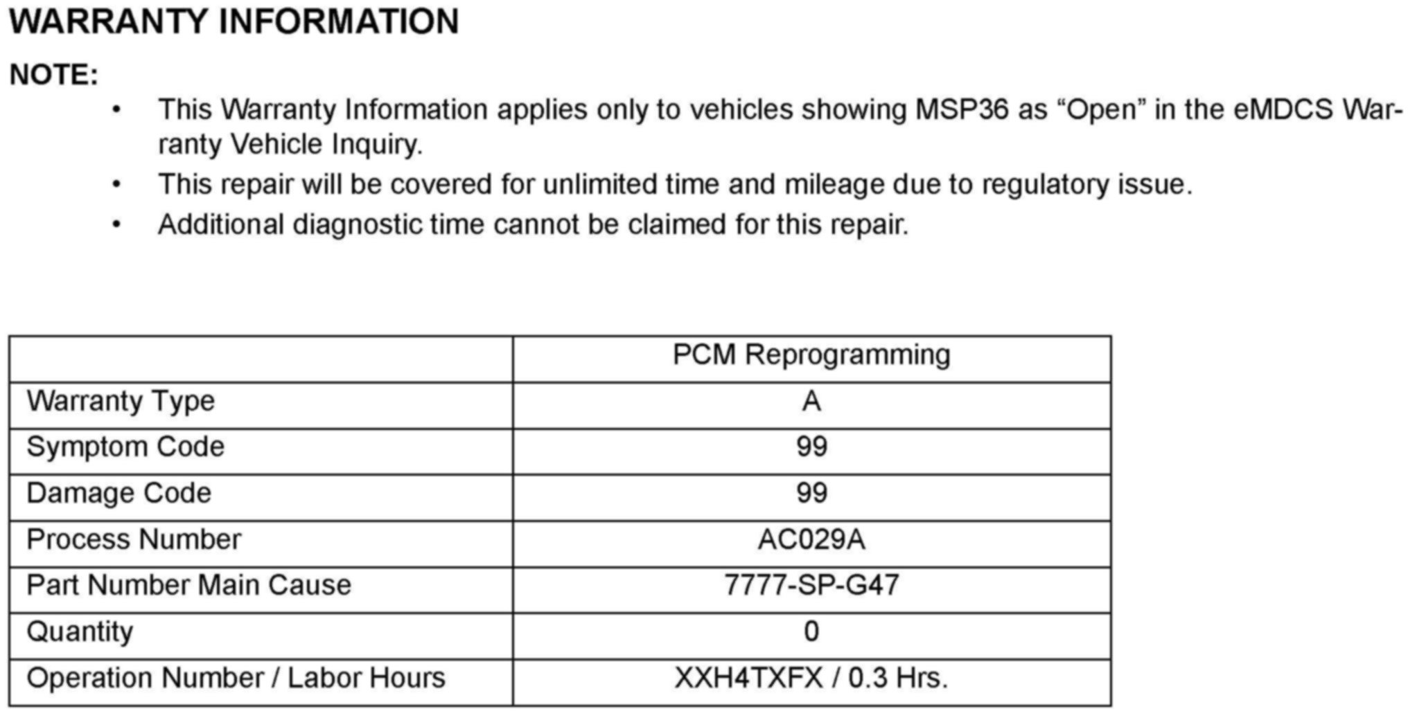 type of repair or scheduled maintenance, perform an eMDCS Warranty Vehicle Inspection and check the status of MSP36. If status of MSP36 is "OPEN" repair the vehicle according to the procedures contained in this service bulletin.