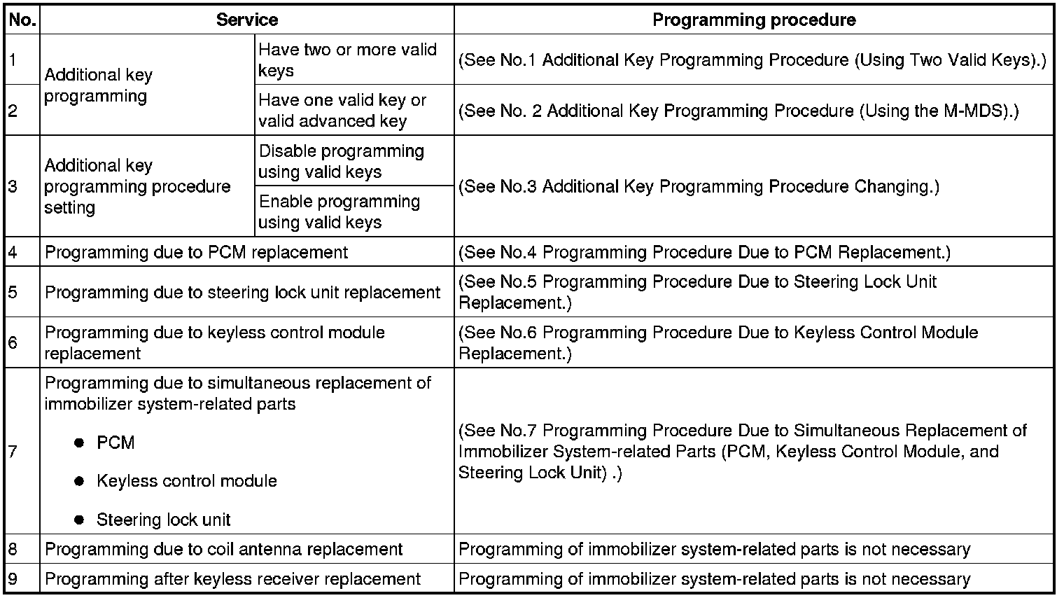 Immobilizer System-Related Parts Service and Programming Procedure Table