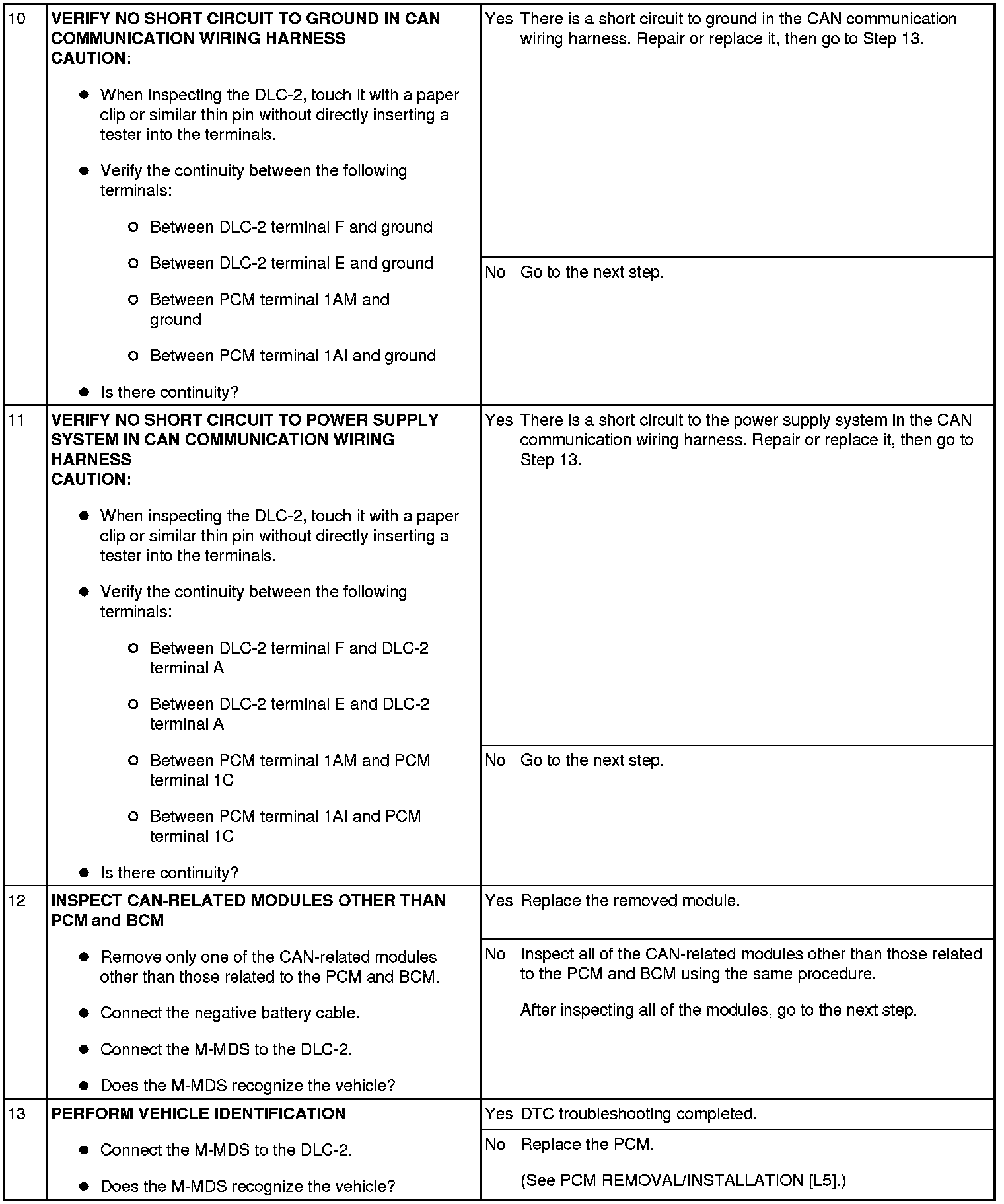 - Possible causes of communication errors between the M-MDS and vehicle include communication circuit interruption due to an open circuit in the CAN communication wiring harness, or poor contact of connector terminals, or a BUS OFF condition due to a short circuit in the CAN communication wiring harness.