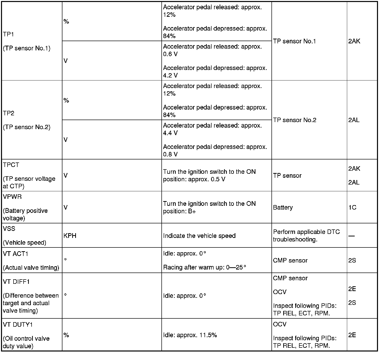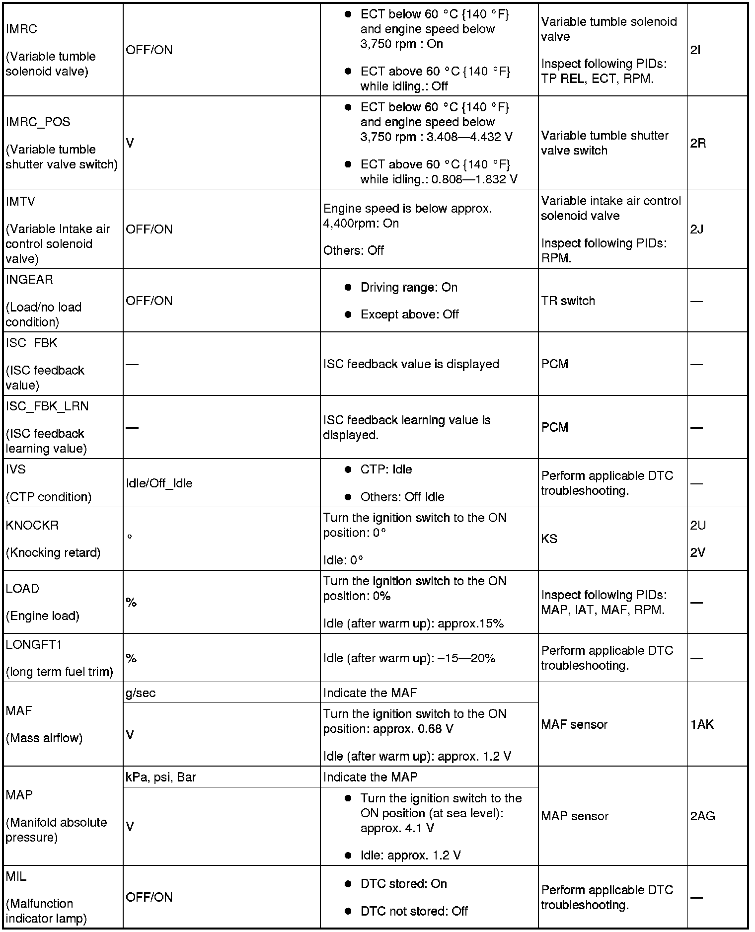 - ACCS, ALTF, ARPMDES, EVAPCP, EVAPCV, FAN_DUTY, FP, IMRC, IMTV, INJ_1~4, SEGRP, TEST, VT Duty1 wt