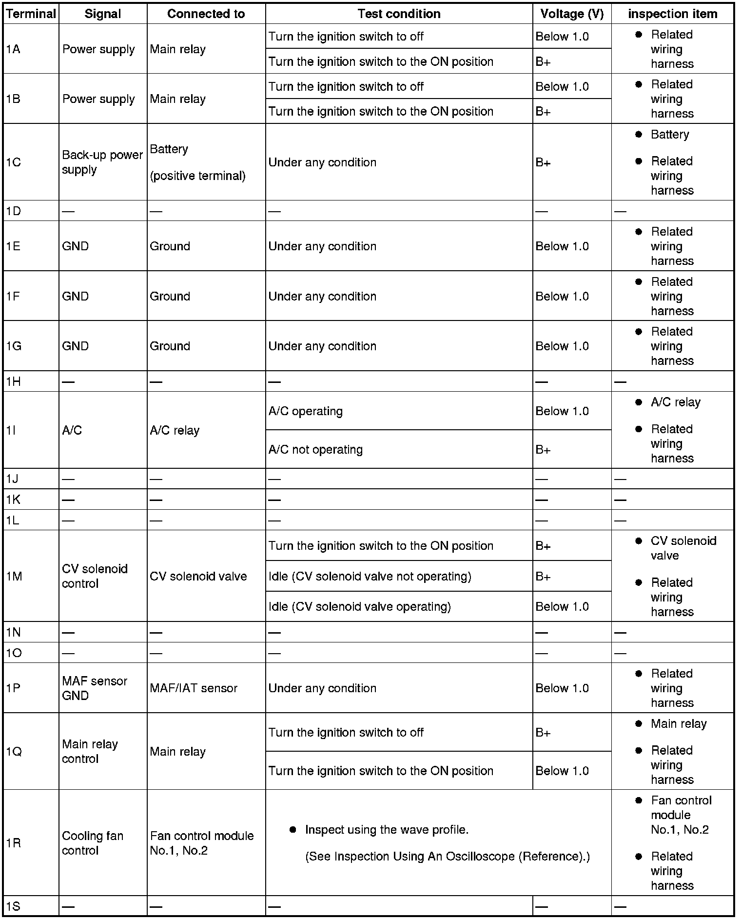 - IGT1(ignition coil No.1): 2G(+)-body ground(-)