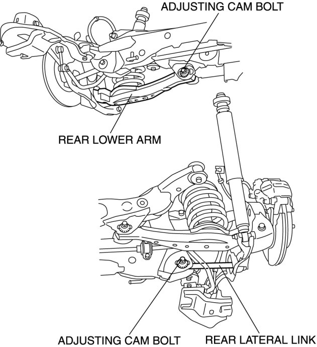 2. Rotate the adjusting cam bolt in either direction to adjust the camber and total toe-in.