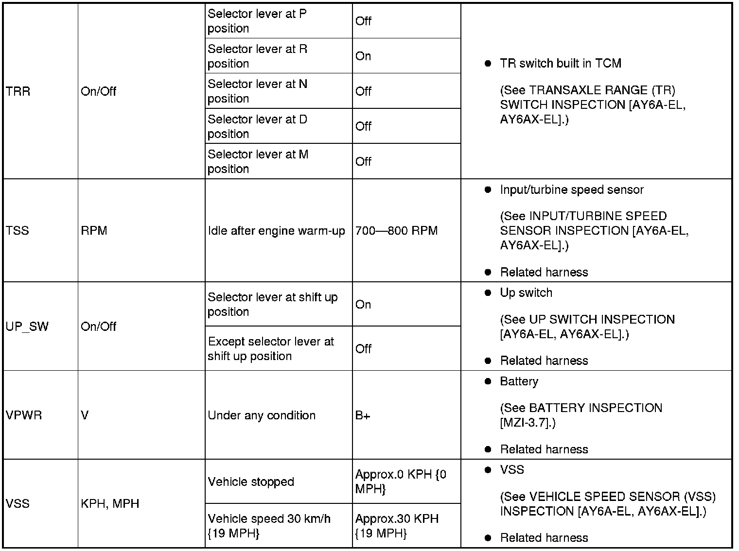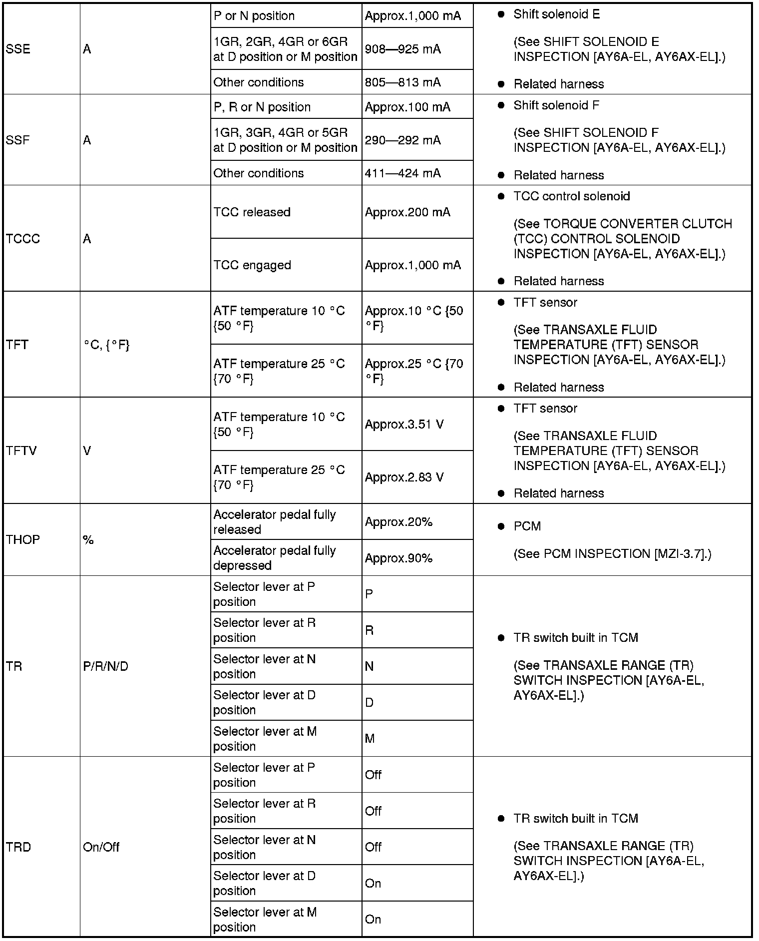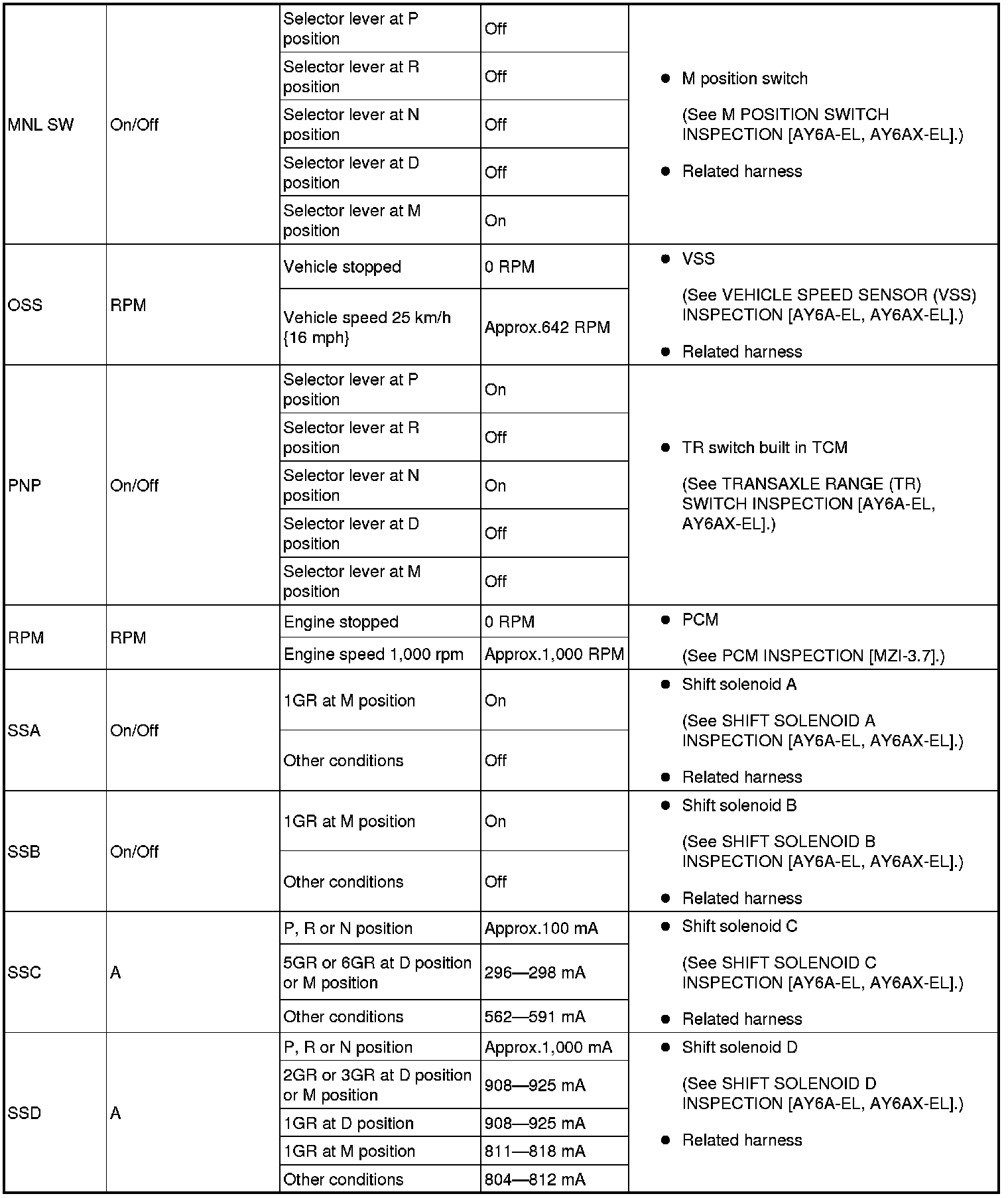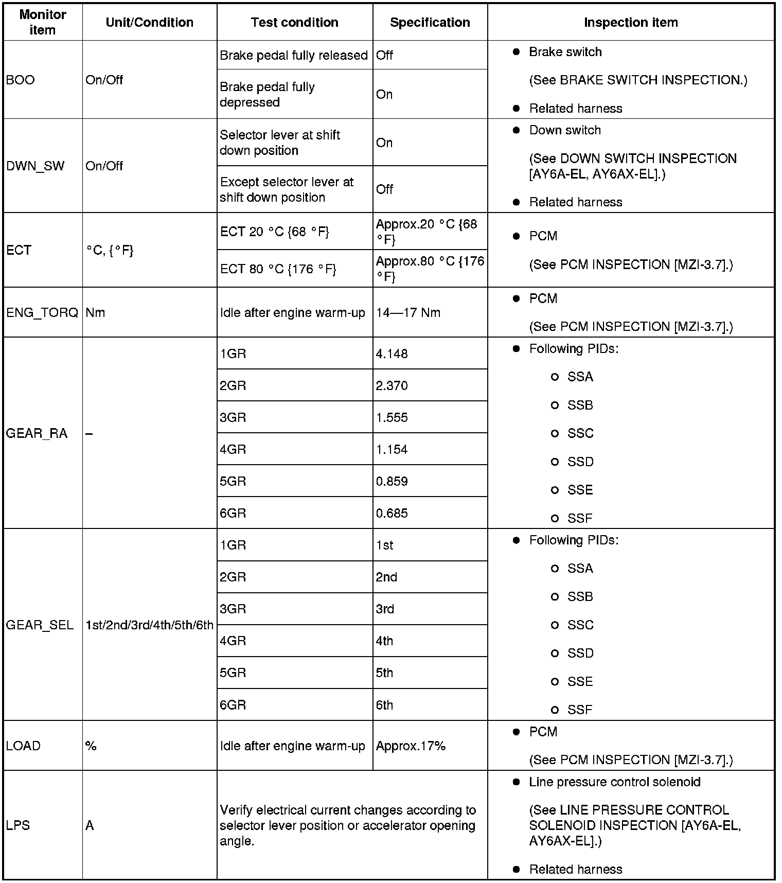Home >> Mazda >> 2012 >> CX-9 AWD V6-3.7L >> Repair and Diagnosis >> Transmission and Drivetrain >> Automatic Transmission/Transaxle >> Testing and Inspection >> Scan Tool Testing and Procedures >> PID/Data Monitor Inspection