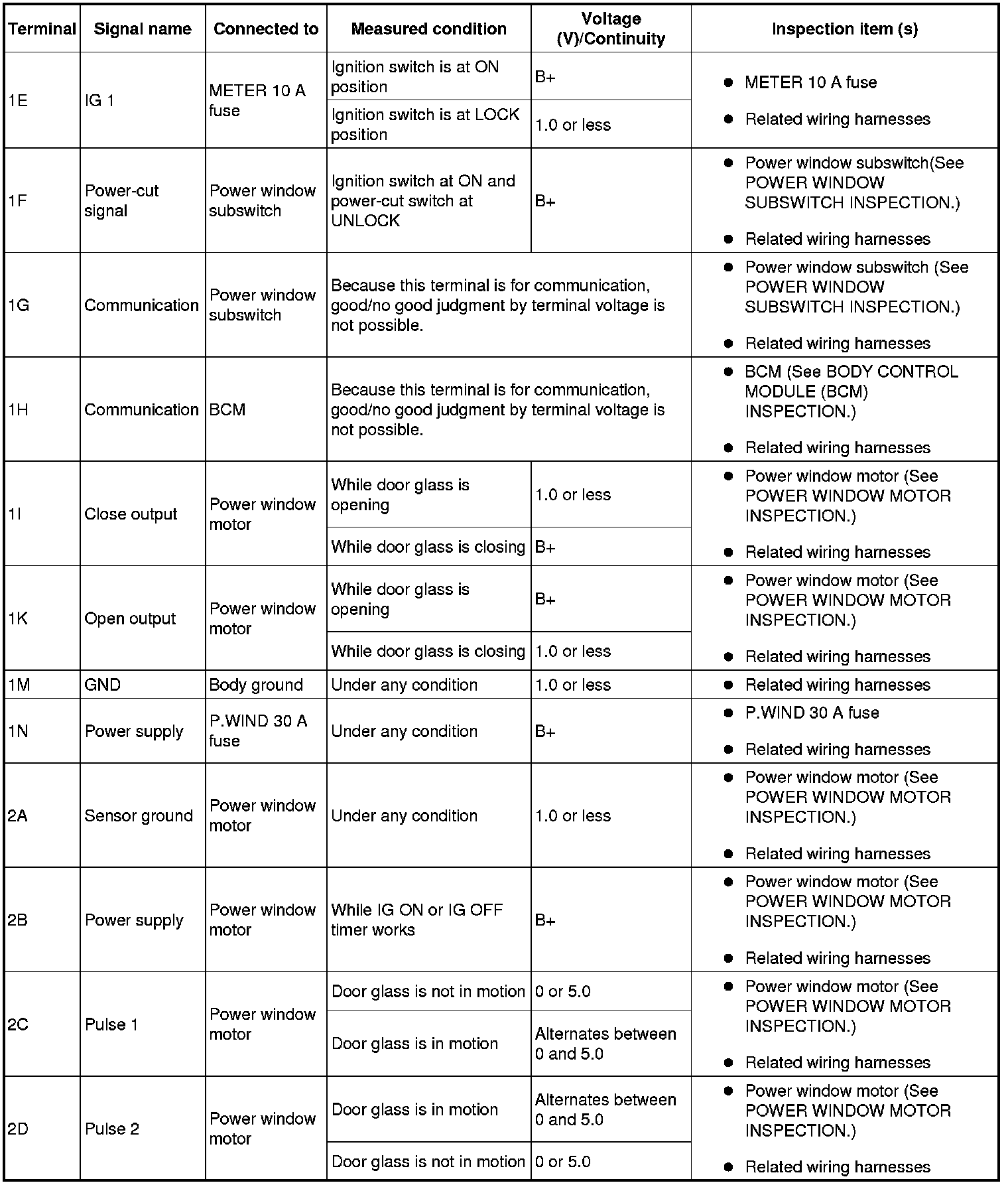 - If the voltage is not as specified in the Terminal Voltage Table, inspect the parts under "inspection item(s)" and related wiring harnesses.