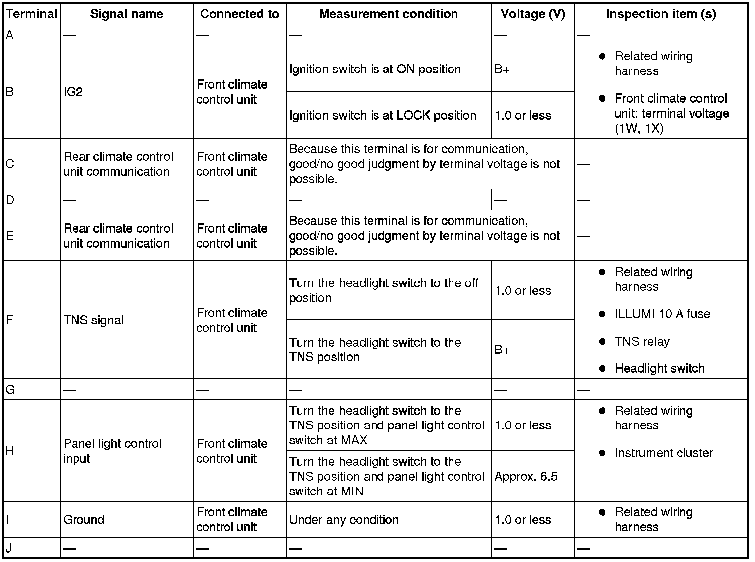 - If the parts under "Inspection item (s)" are found to be normal, replace the rear climate control unit.