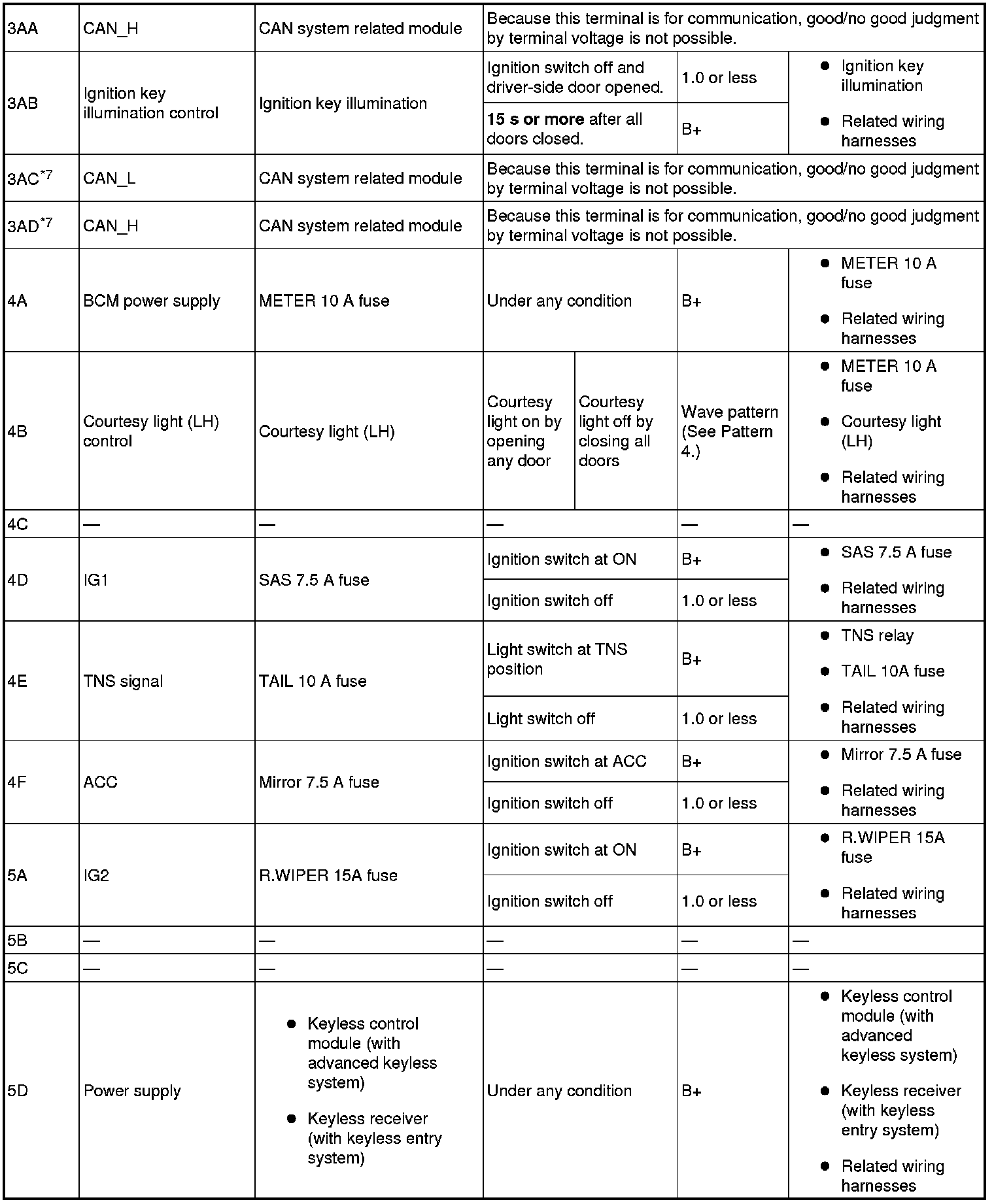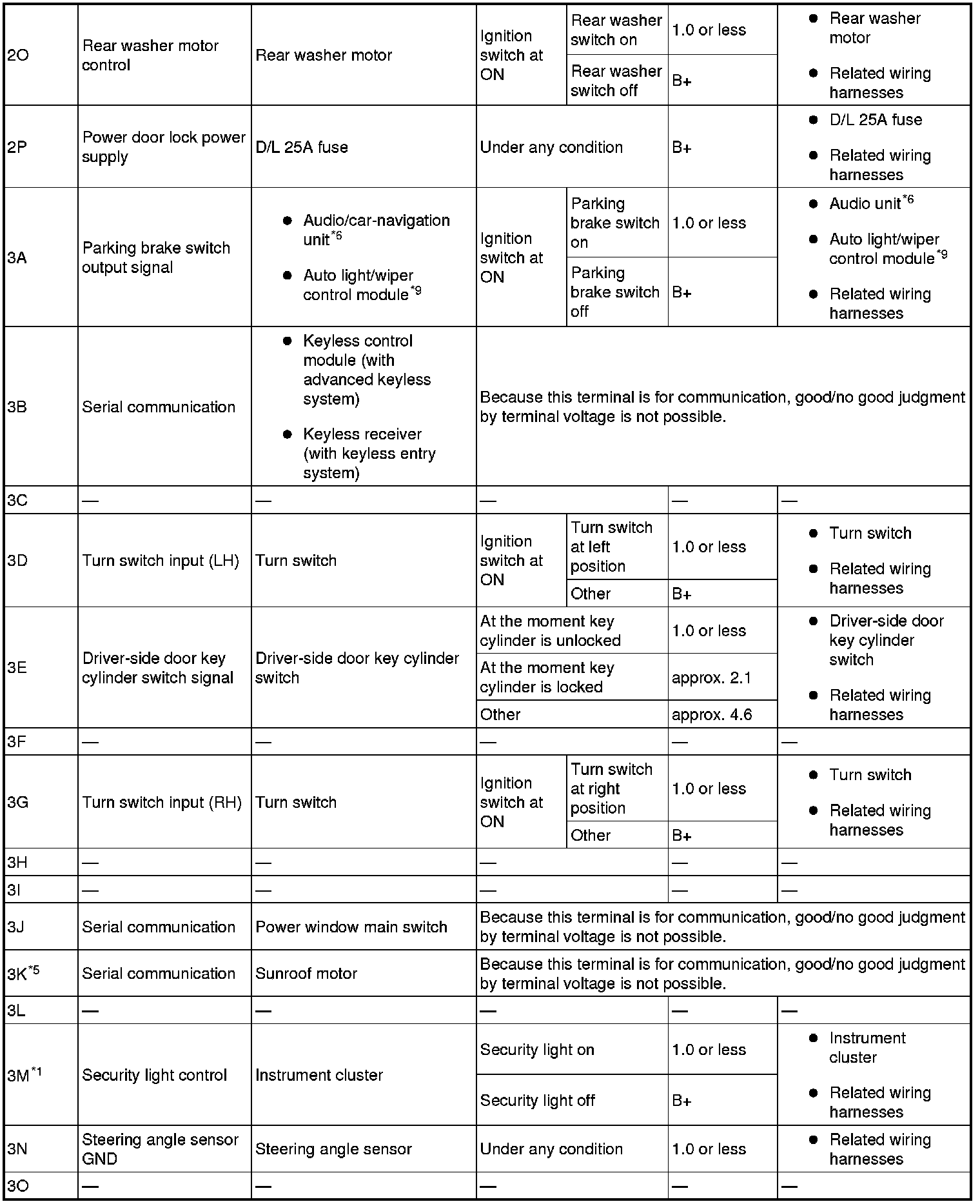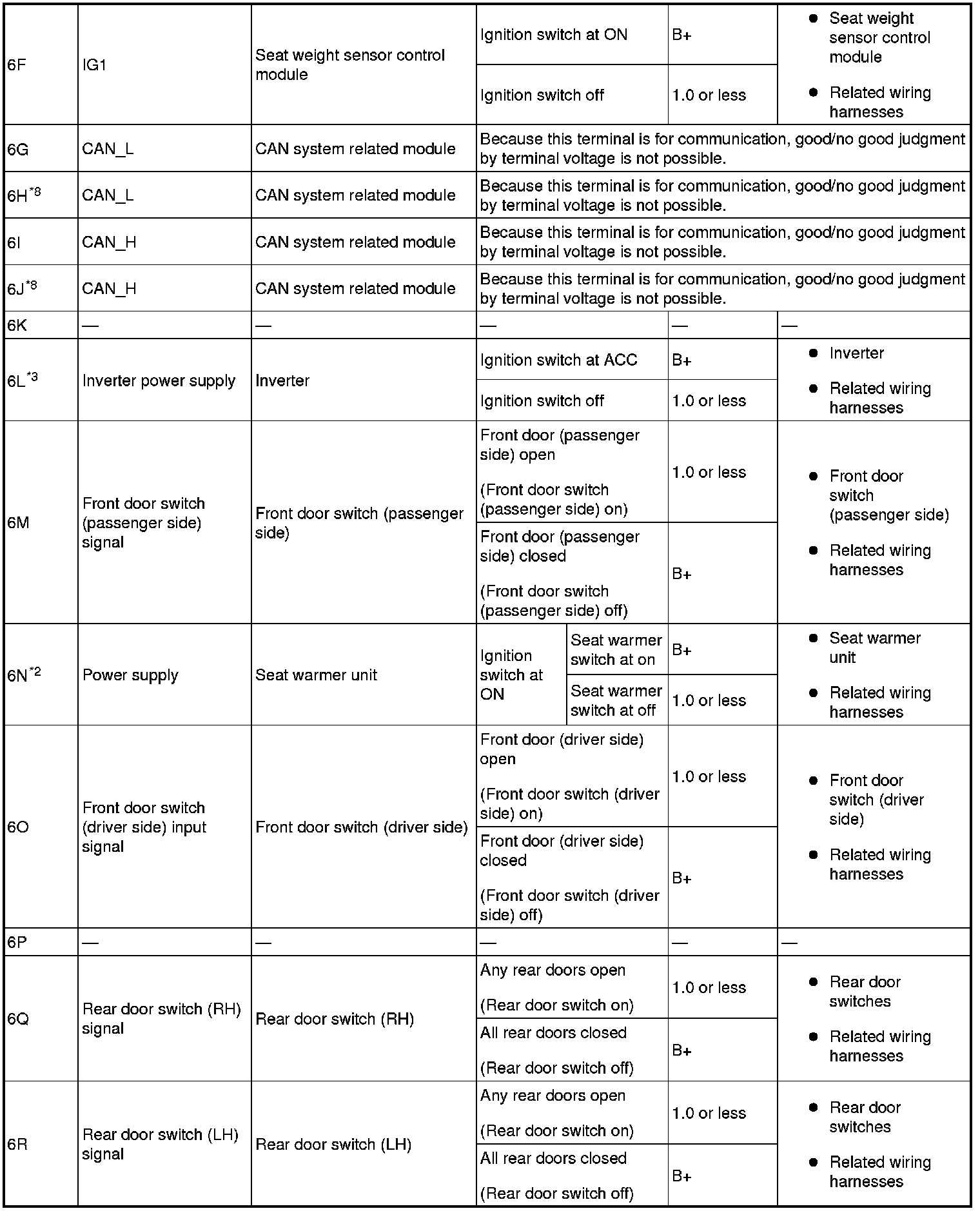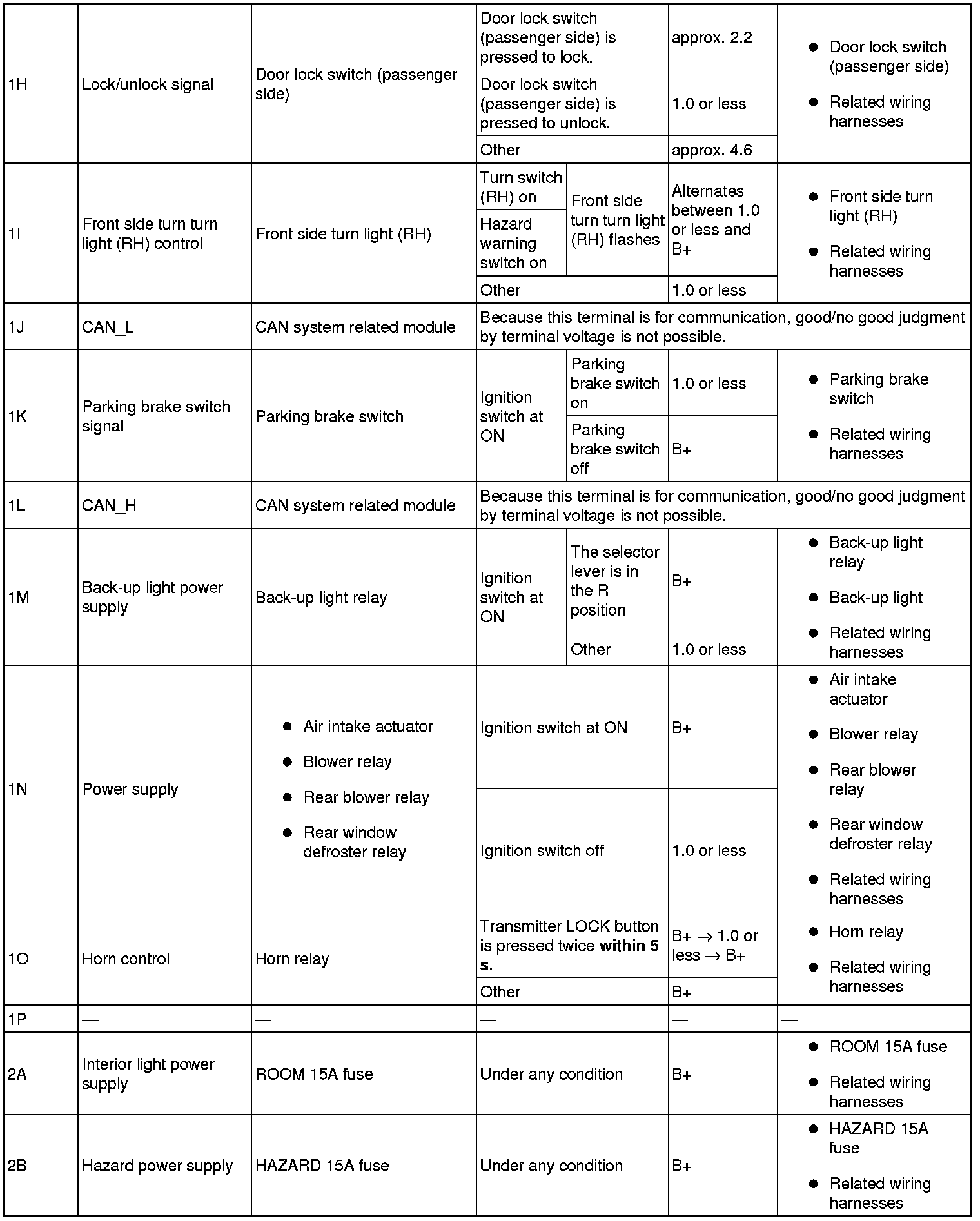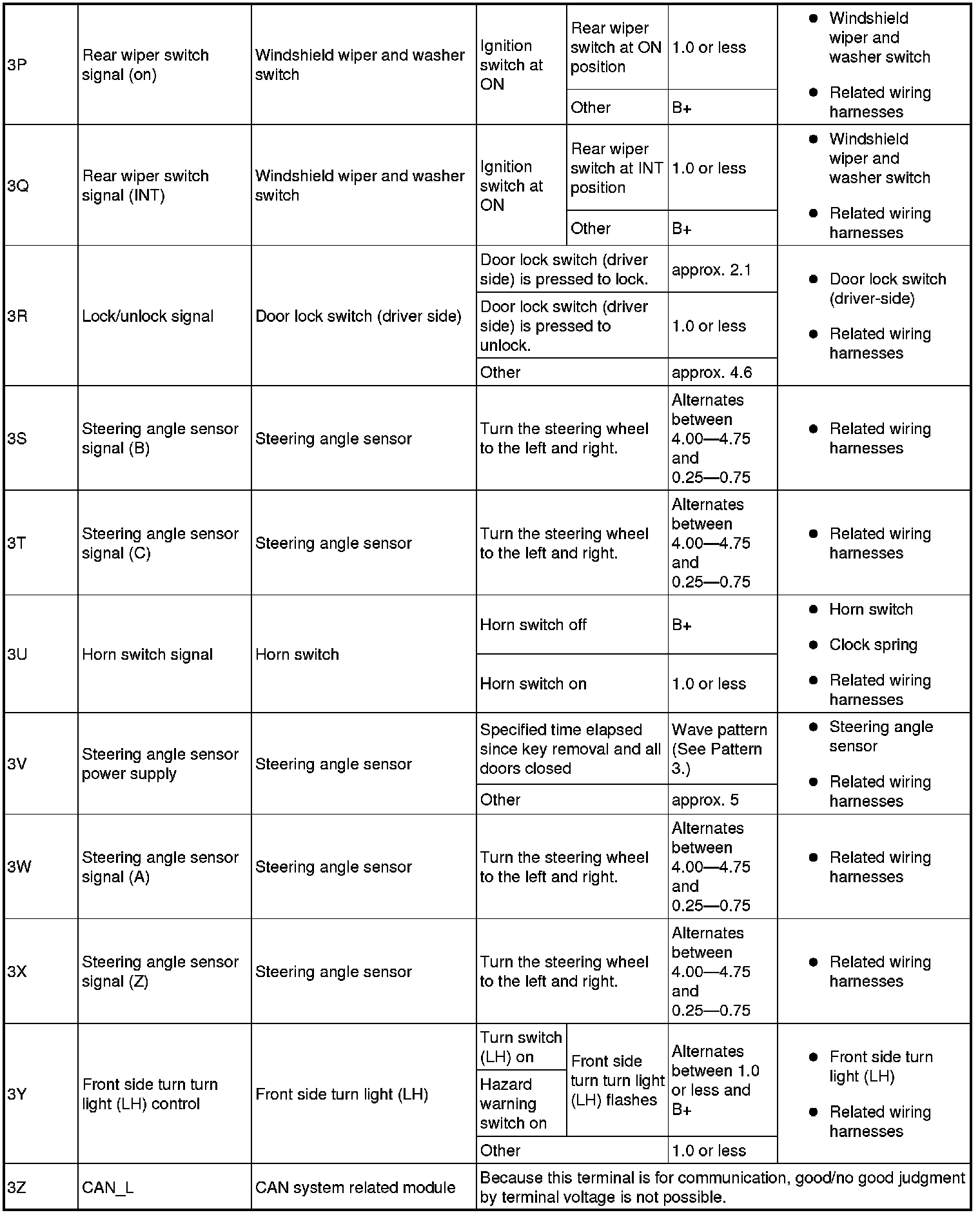 - If the voltage is not as specified in the Terminal Voltage Table, inspect the parts under "Inspection item (s)".