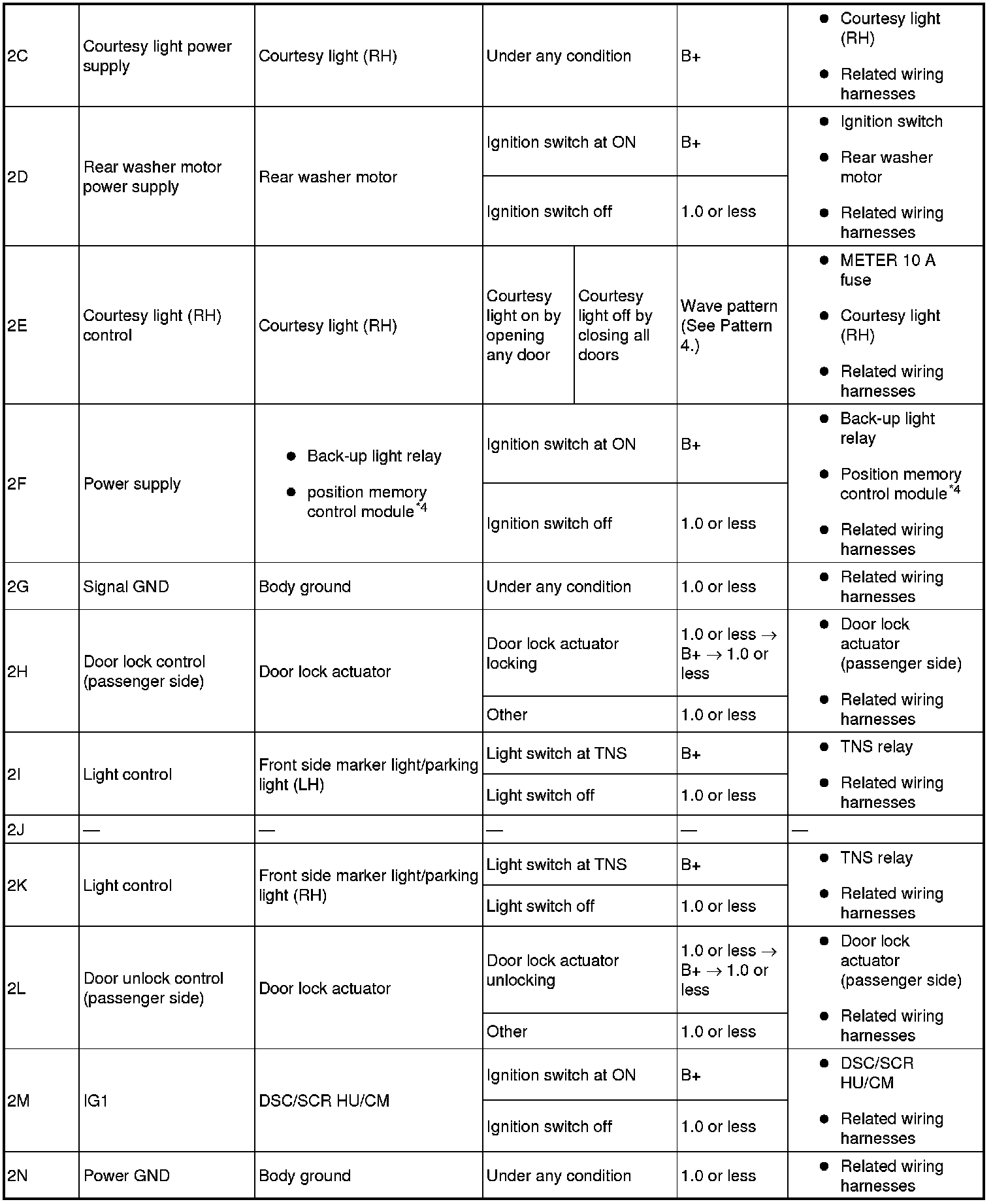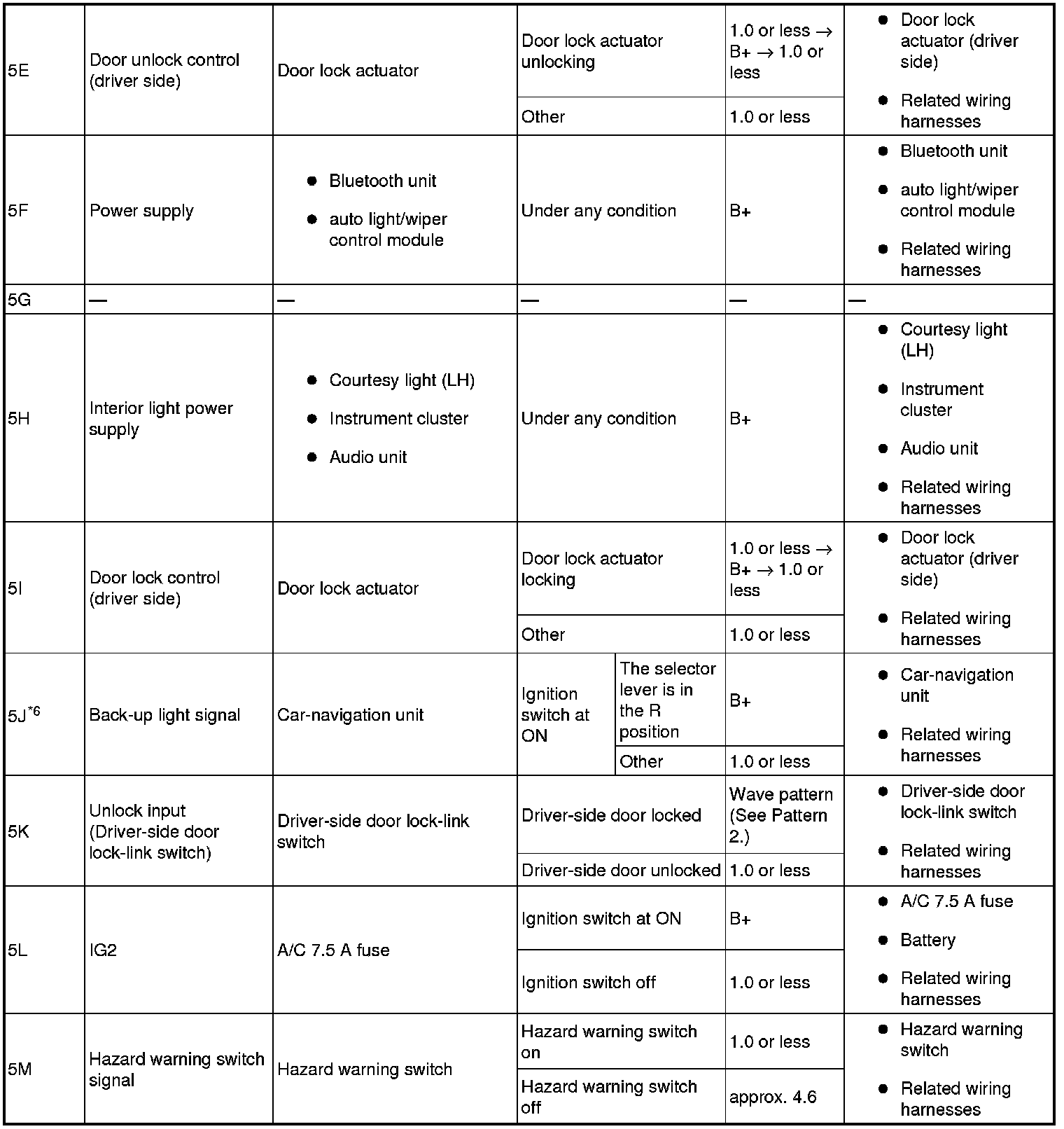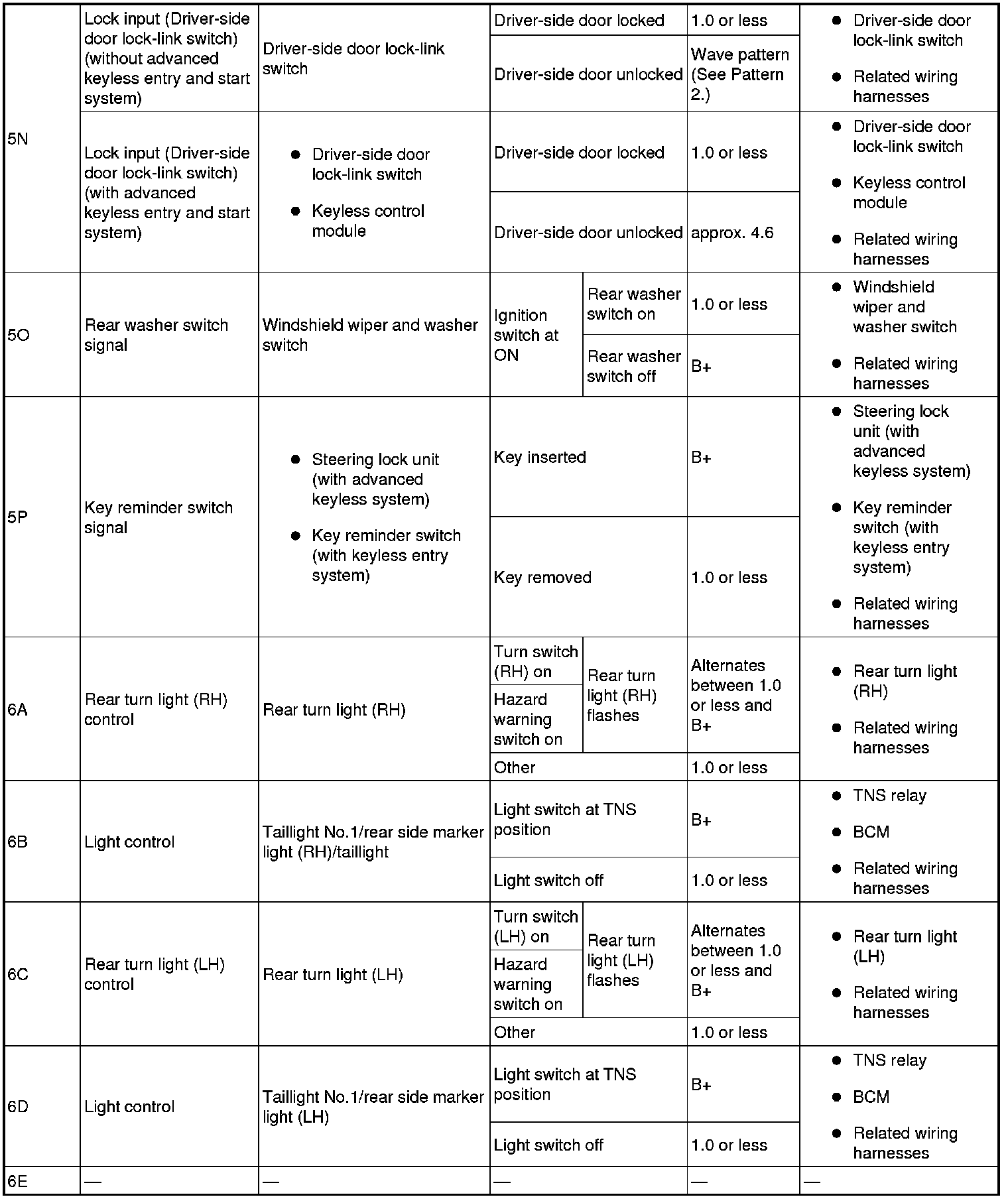 - Lock/unlock input (rear door lock-link switch (RH): 6W (+) -> body ground (-)