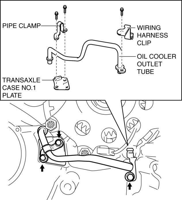 55. Install the oil cooler outlet tube, pipe clamp, transaxle case No.1 plate and the wiring harness clip to the converter housing.