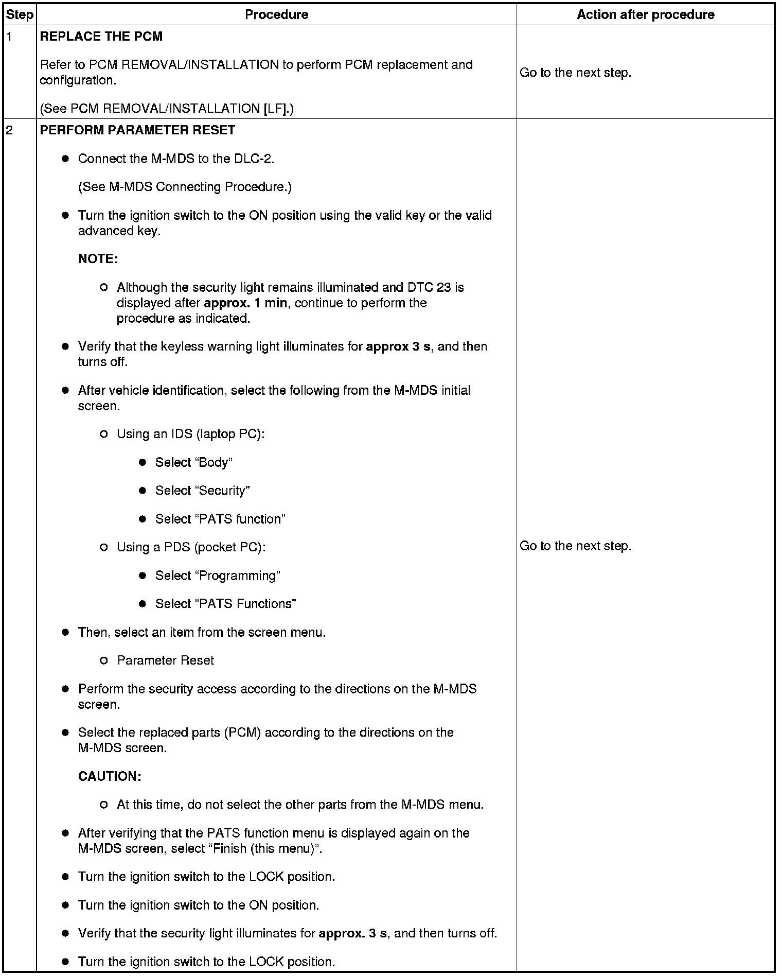 No.7 Programming Procedure Due to Simultaneous Replacement of Immobilizer System-related Parts (PCM, Keyless Control Module, and Steering Lock Unit)