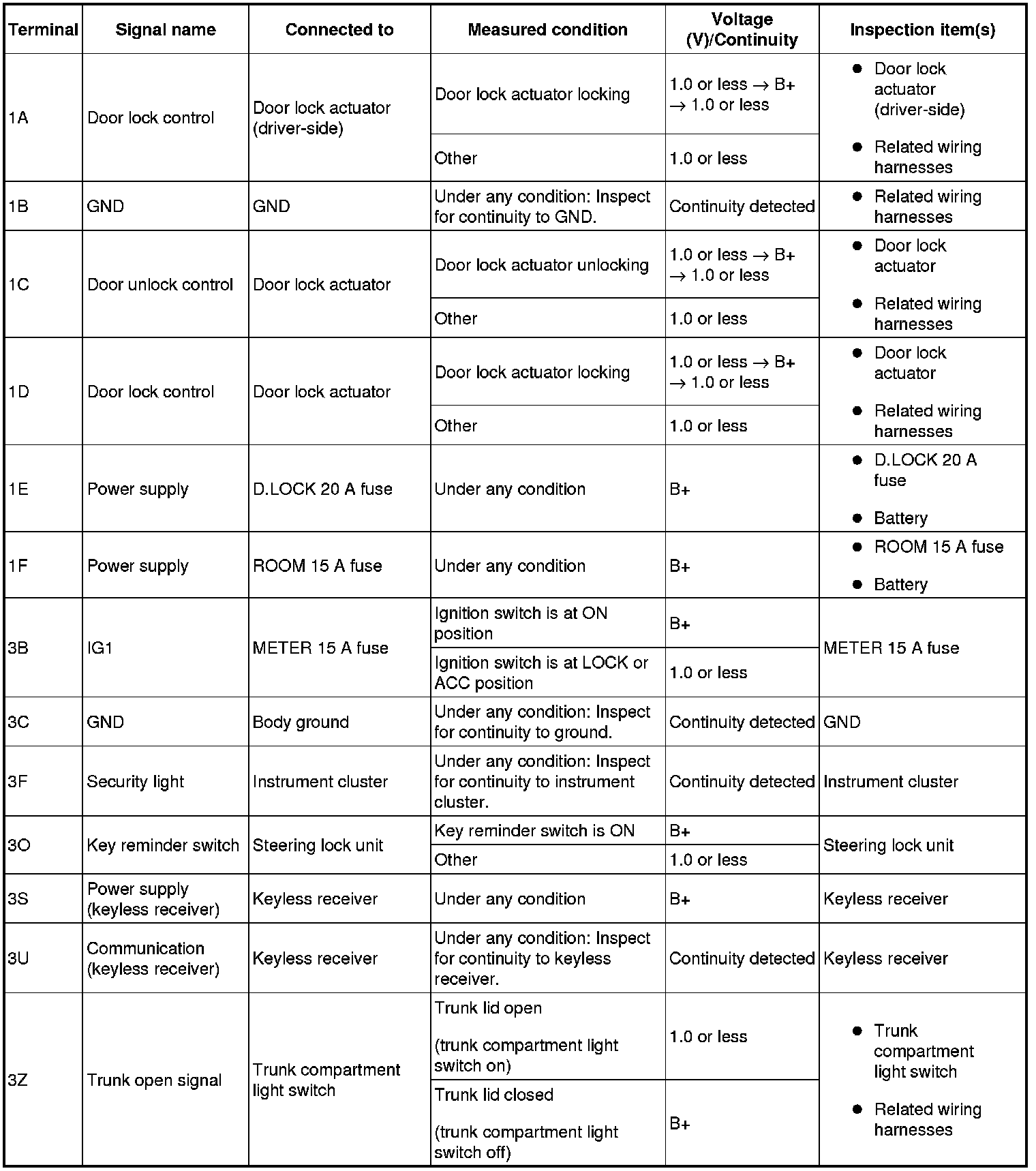 1. Measure the voltage or inspect for continuity according to the Terminal Voltage Table (Reference).