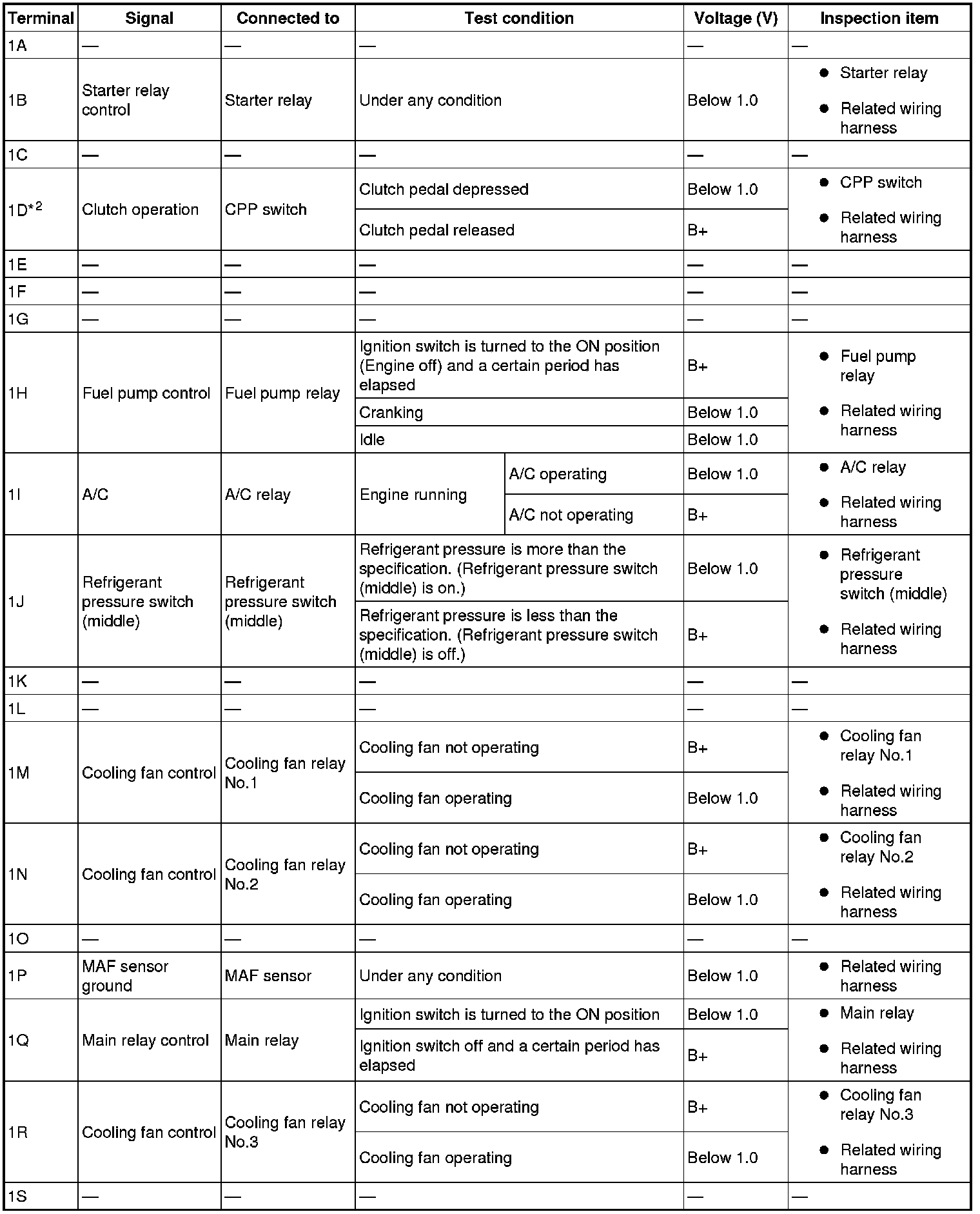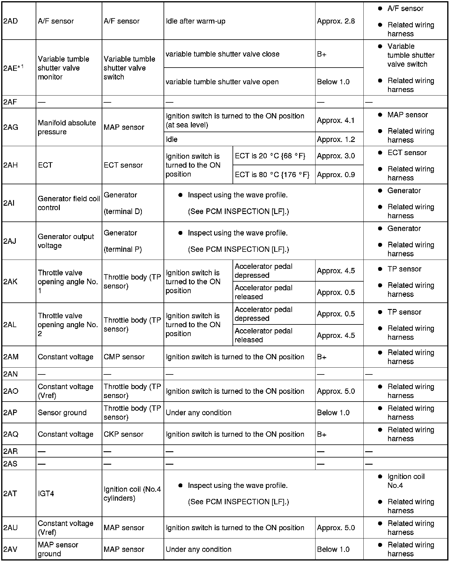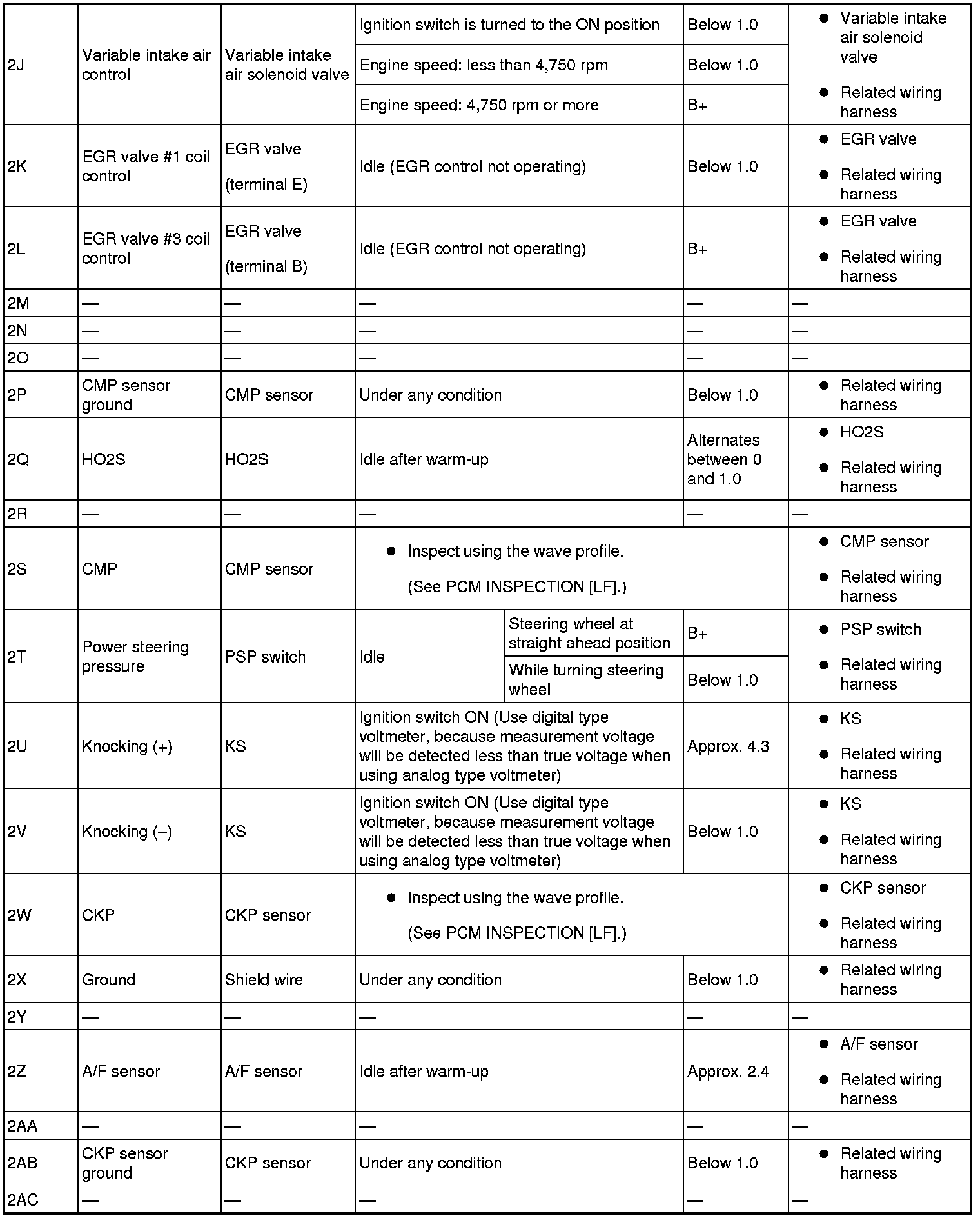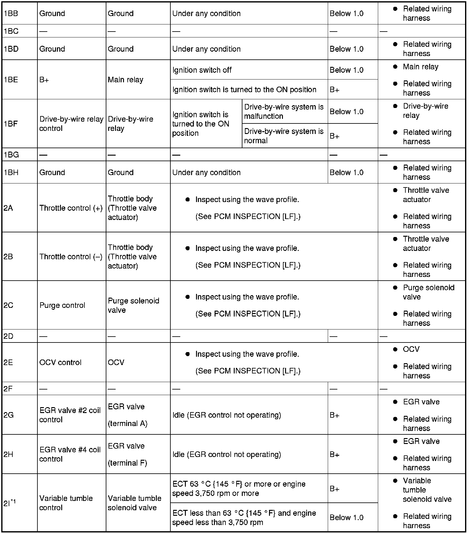 - The PCM terminal voltage can vary with the conditions when measuring and changes due to aged deterioration on the vehicle, causing false diagnosis. Therefore determine comprehensively where the malfunction occurs among the input systems, output systems, and the PCM.