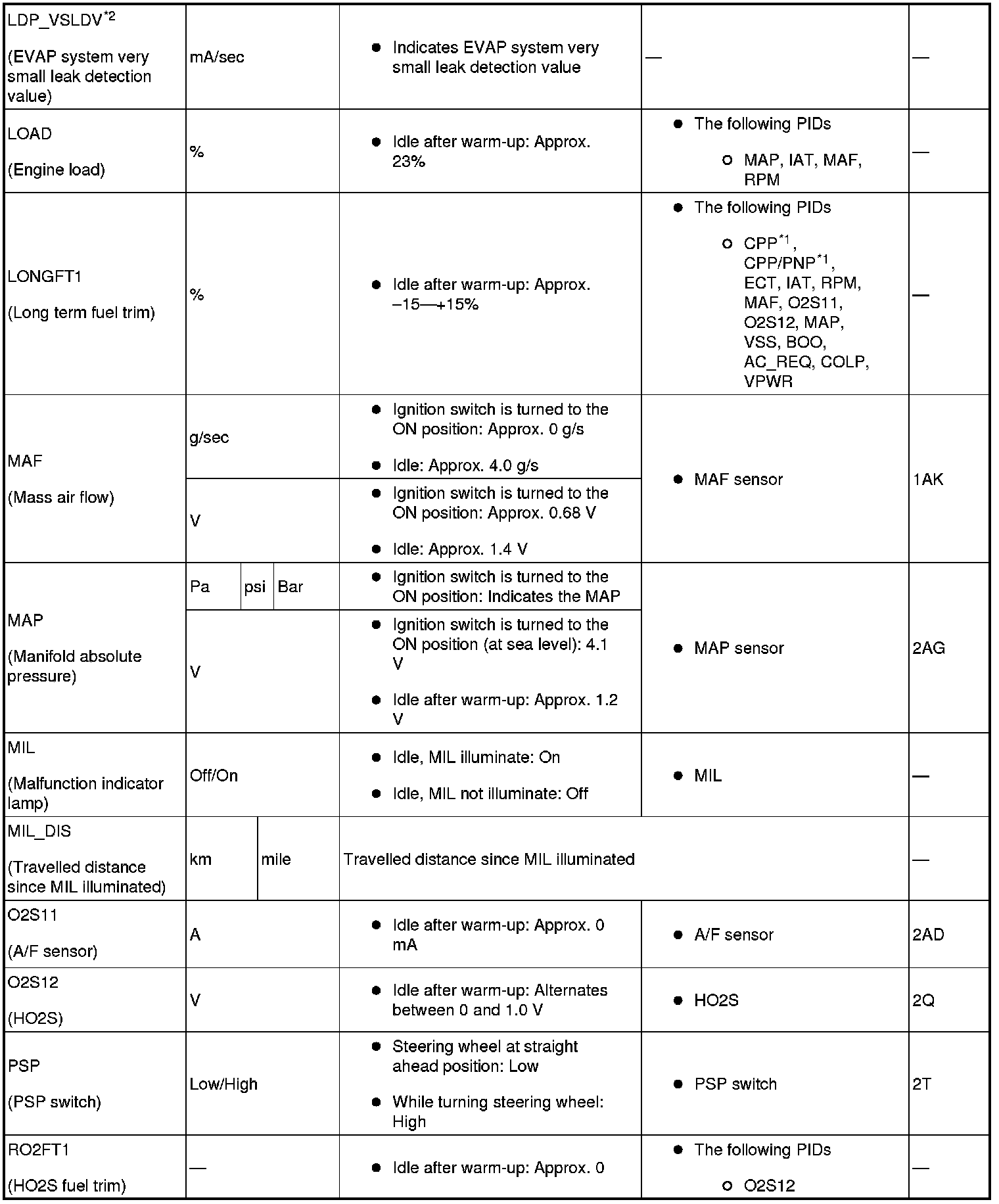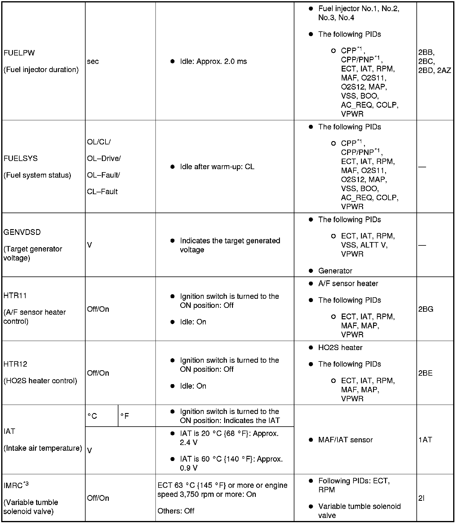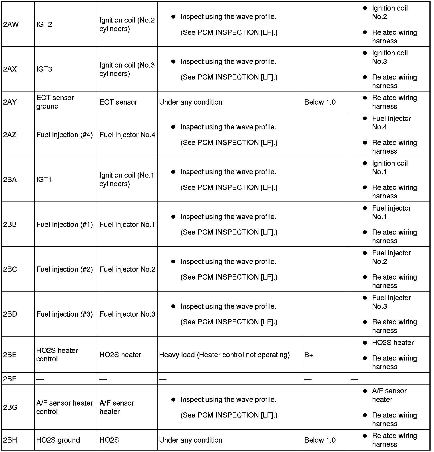 - PIDs for the following parts are not available on this model. Go to the appropriate inspection part.