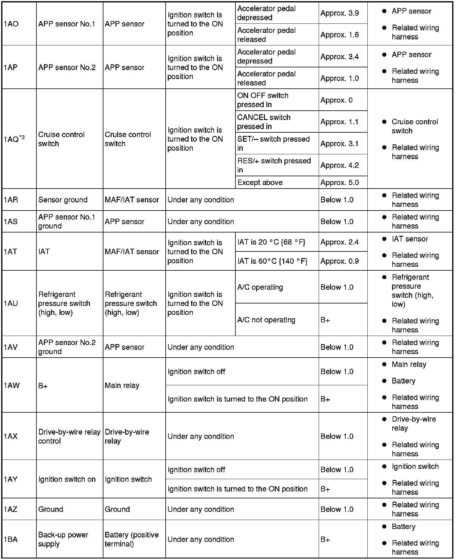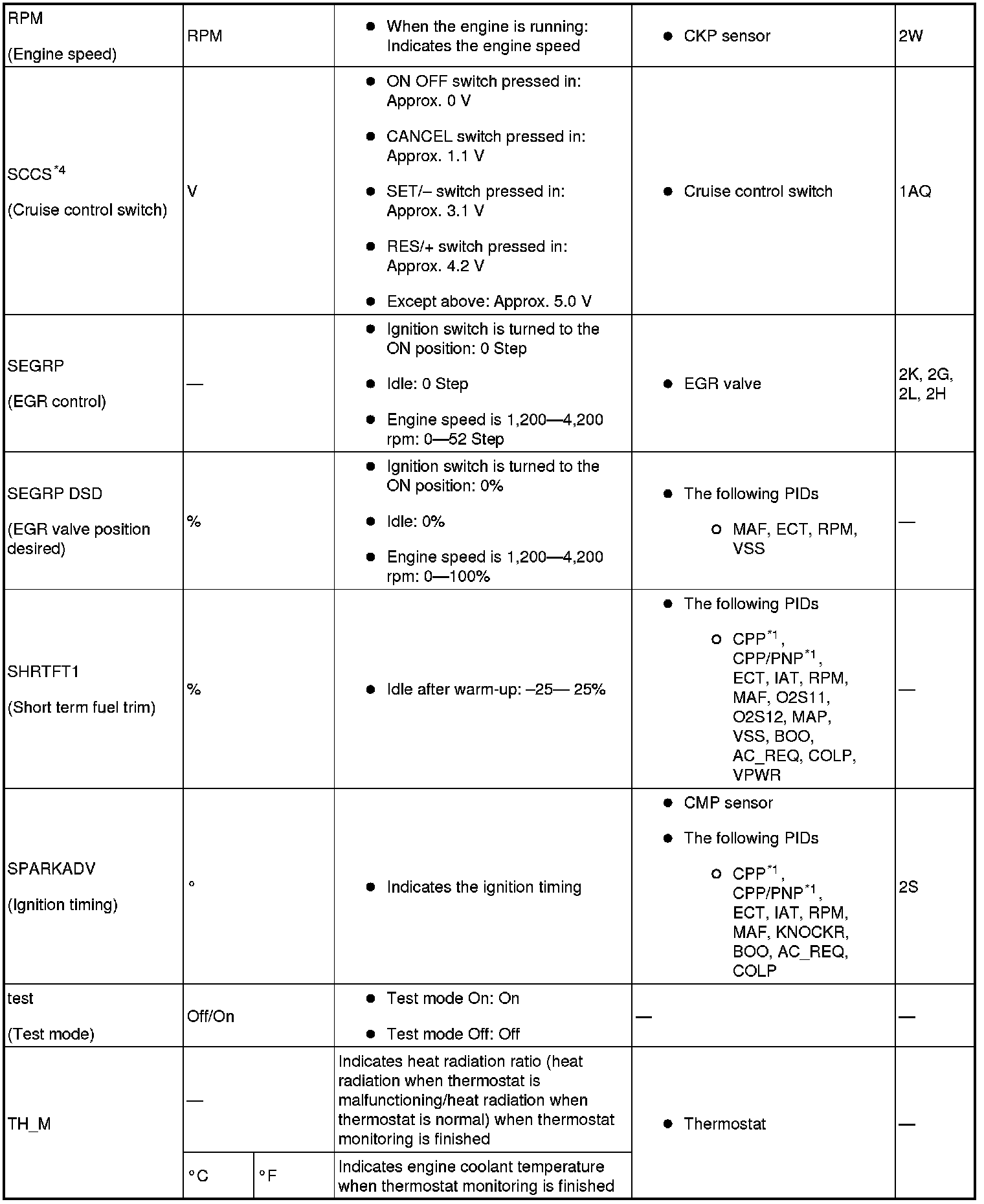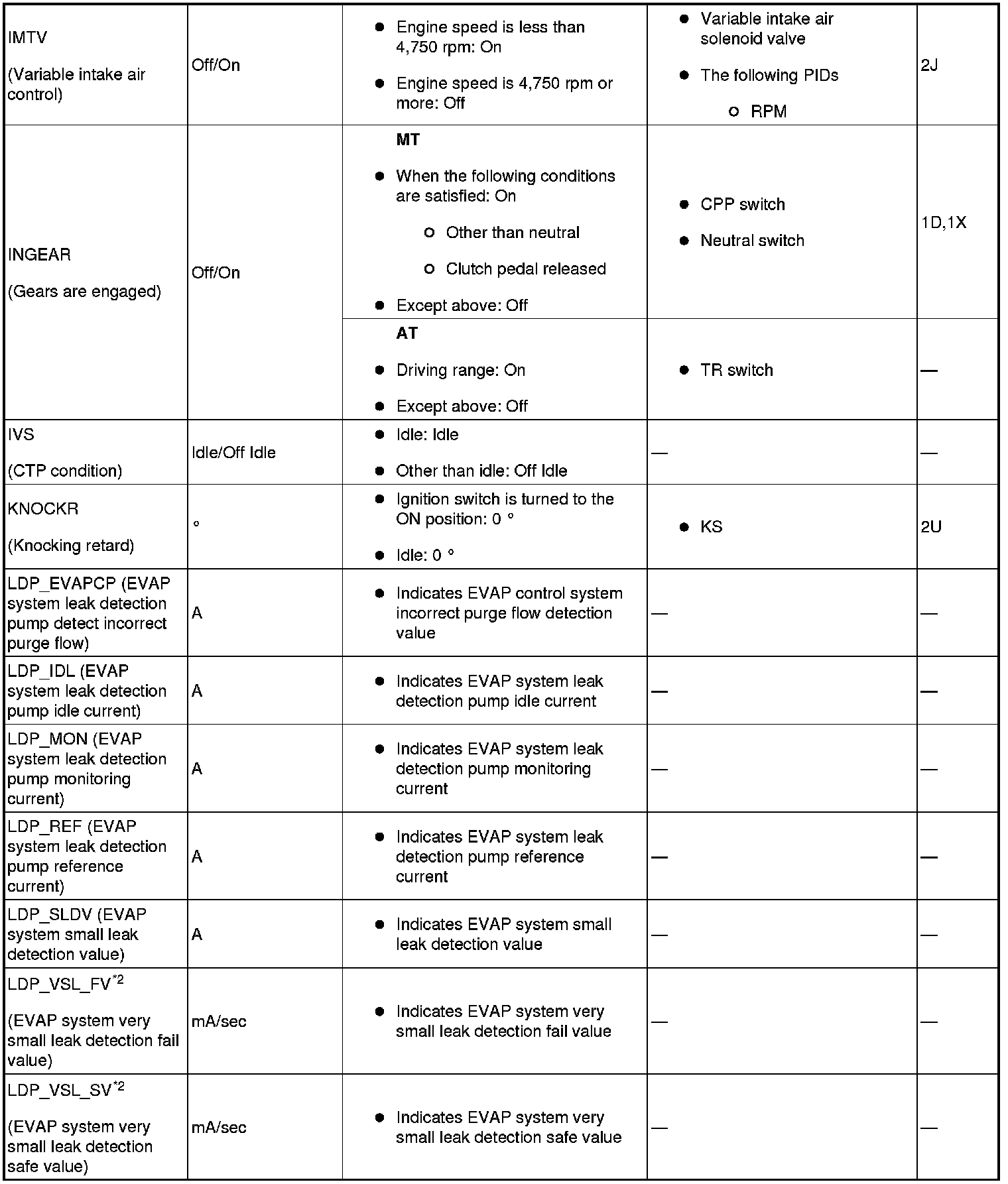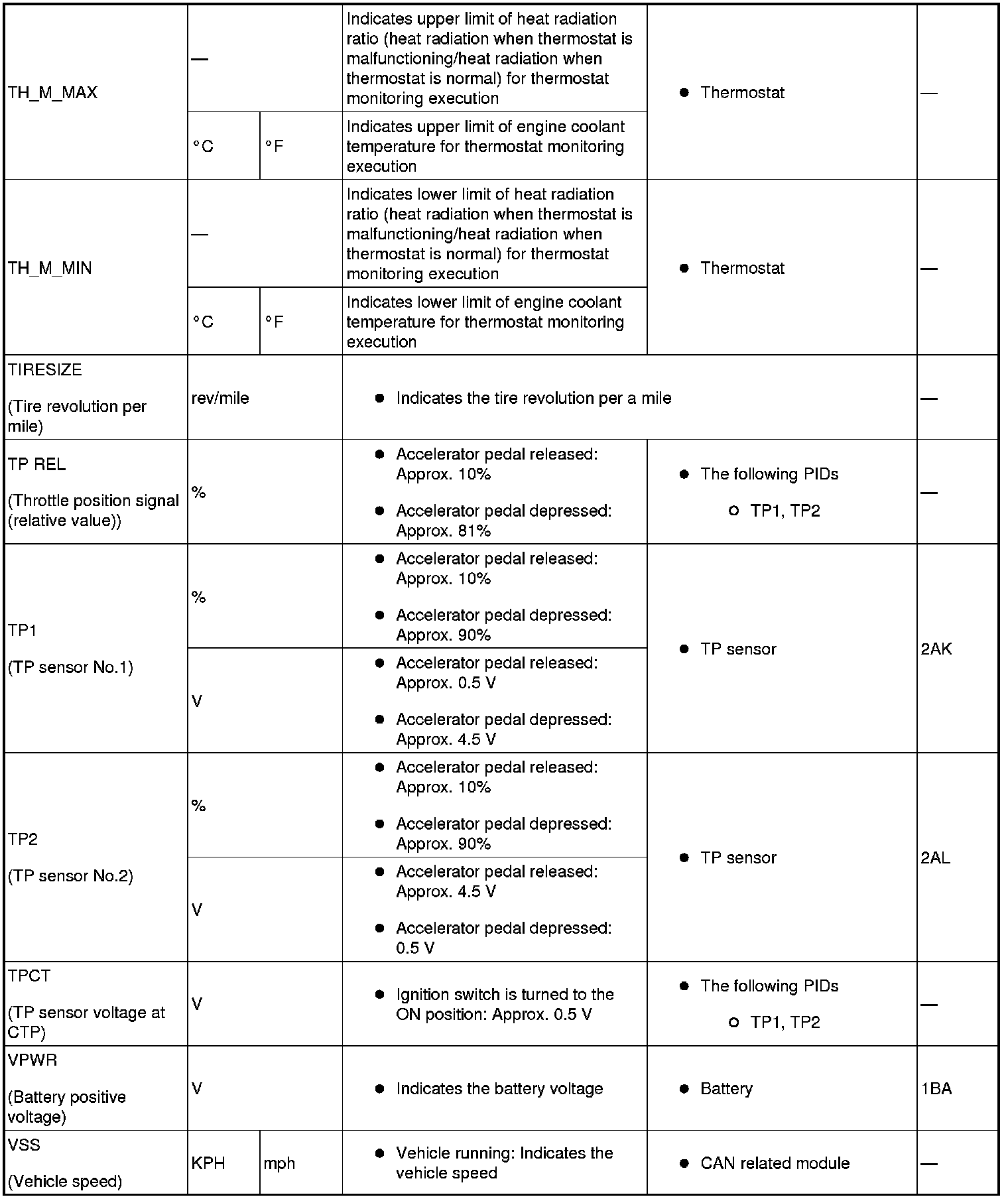 - PIDs for the following parts are not available on this model. Go to the appropriate inspection part.