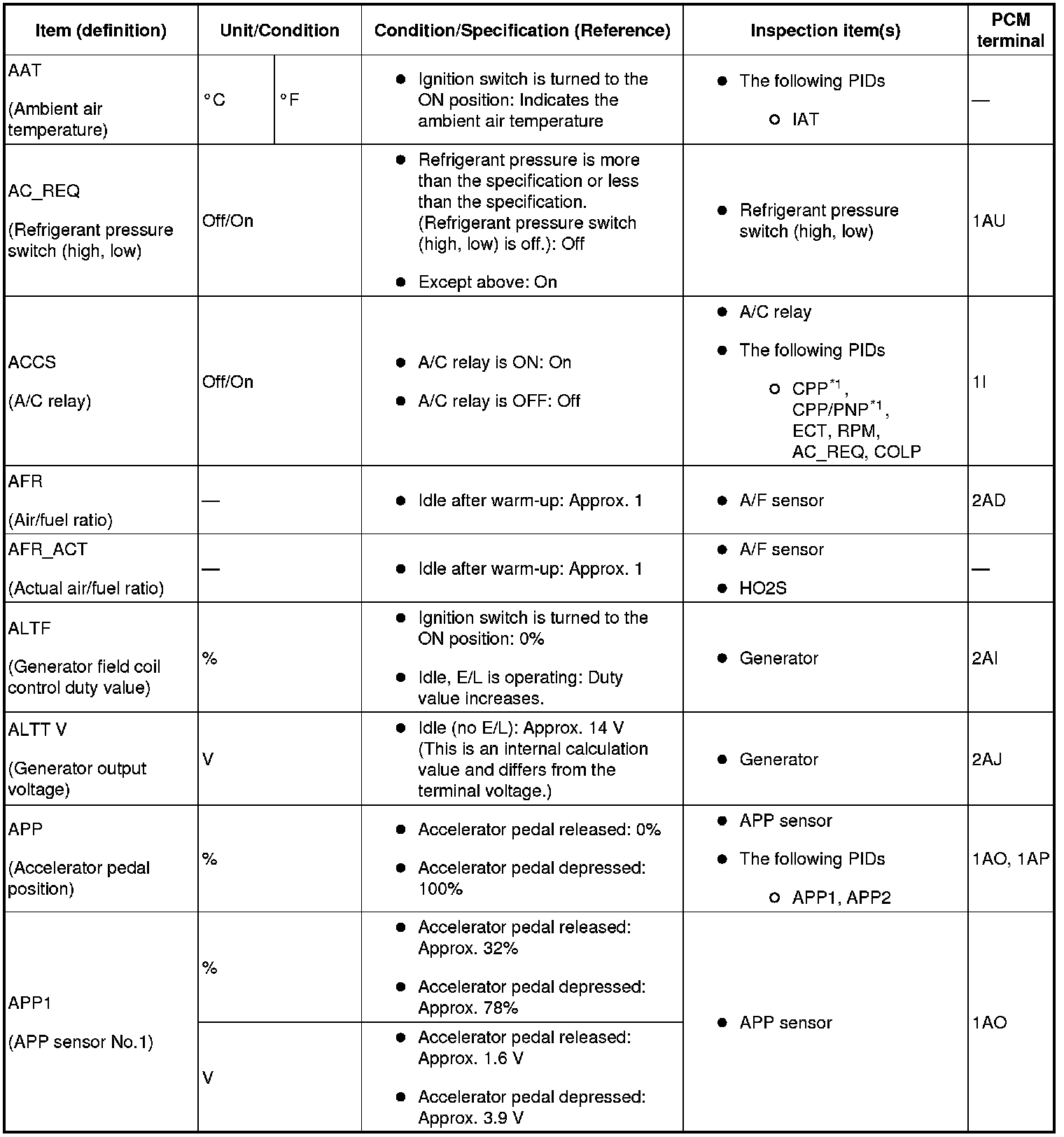 - If PID value is not within the specification, follow the instructions in "Inspection item (s)" column.