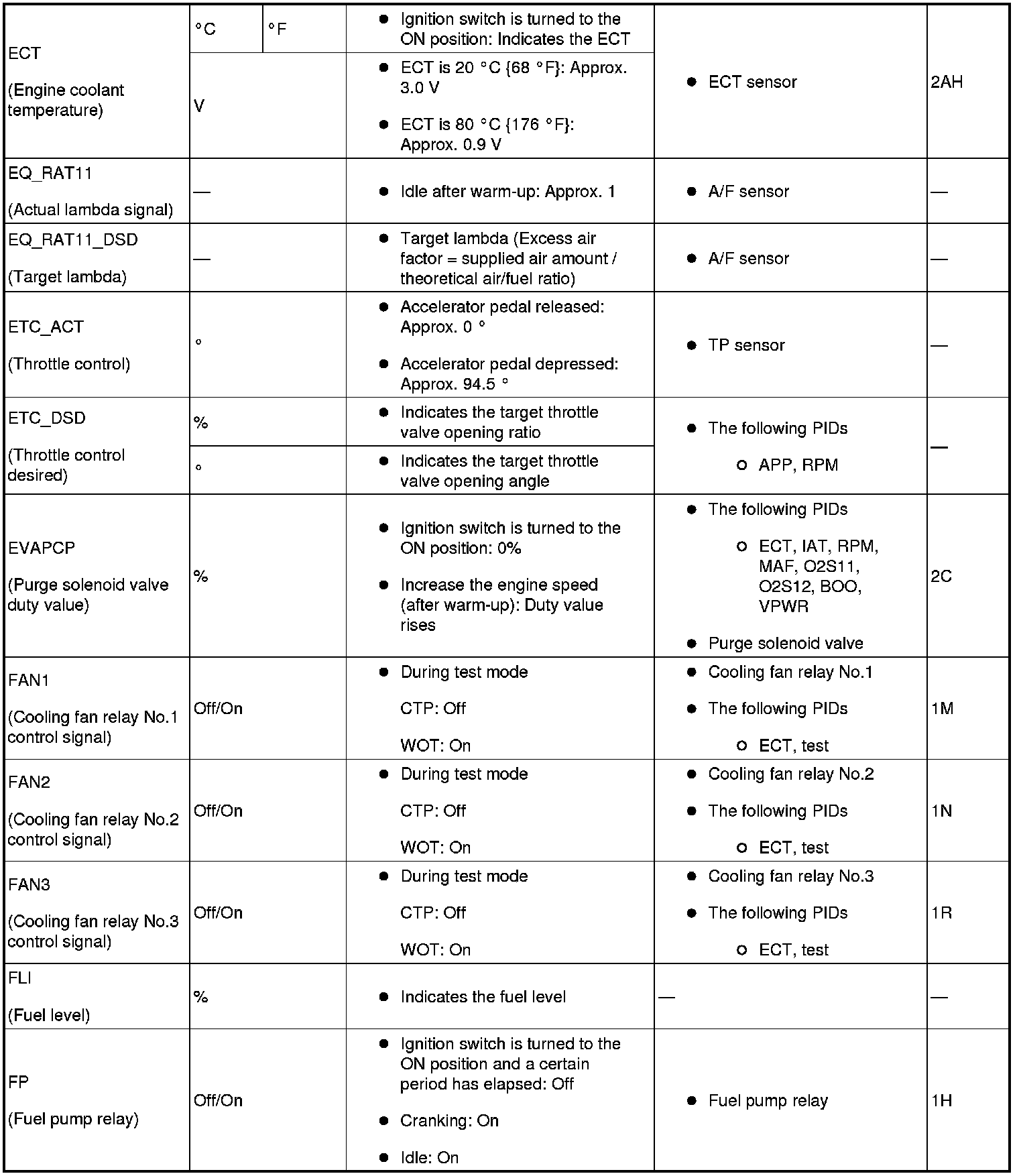 - ACCS, ALTF, ARPMDES, EVAPCP, FAN1, FAN2, FAN3, FP, FUELPW1, GENVDSD, HTR11, HTR12, IMTV, INJ_1, INJ_2, INJ_3, INJ_4, SEGRP, test, VT DUTY1 Wt