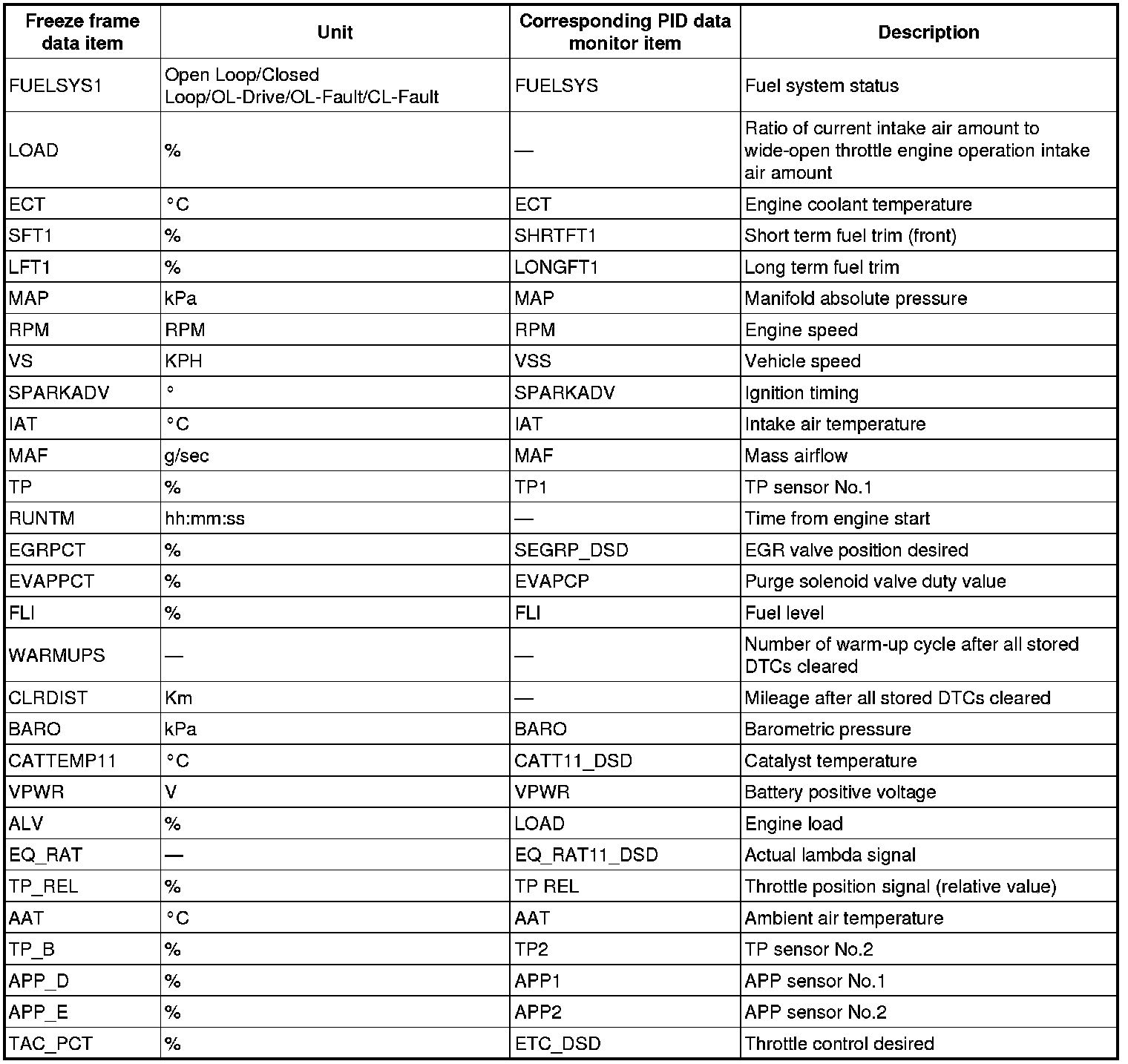 Freeze frame data table (mode2, mode12) table