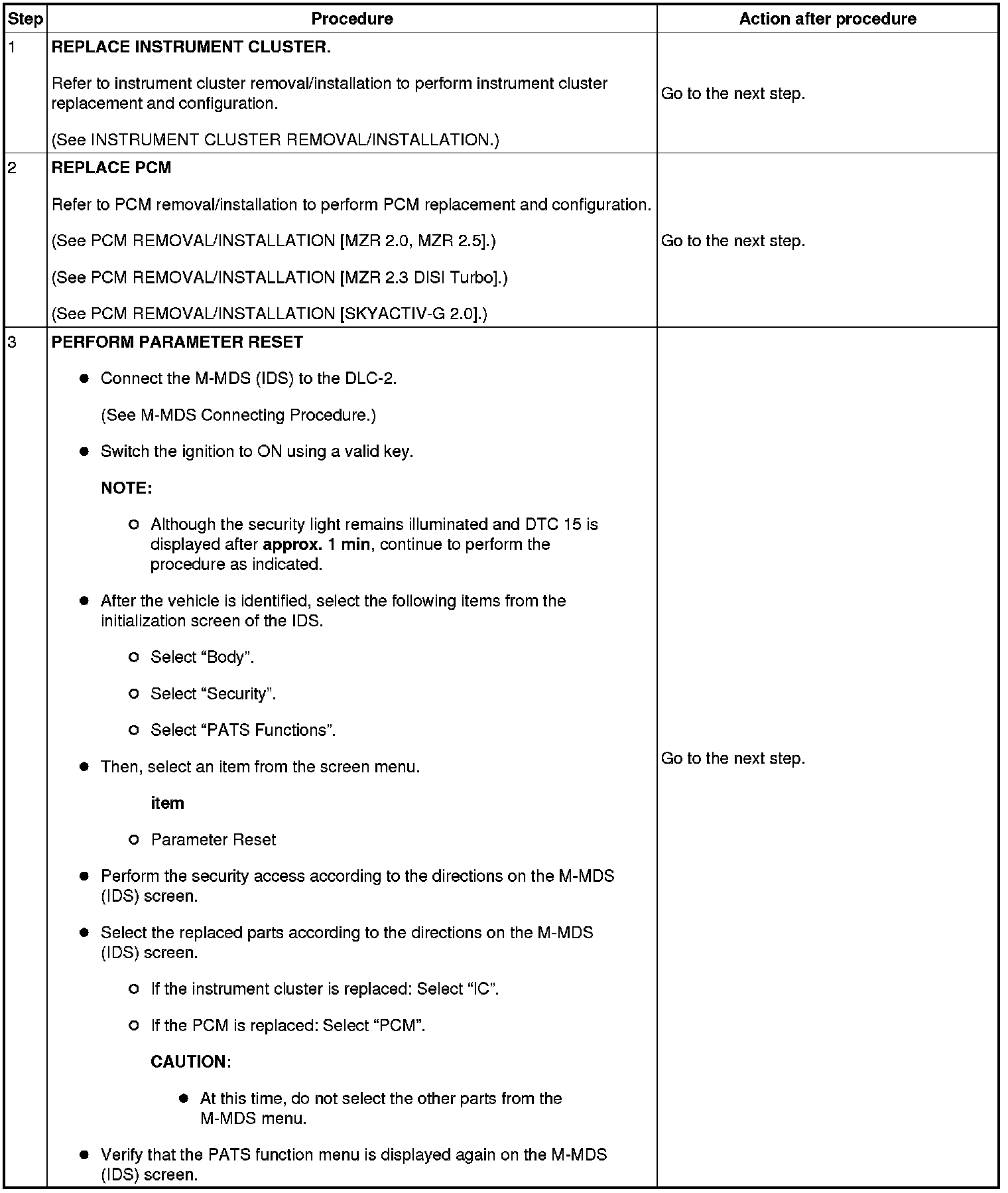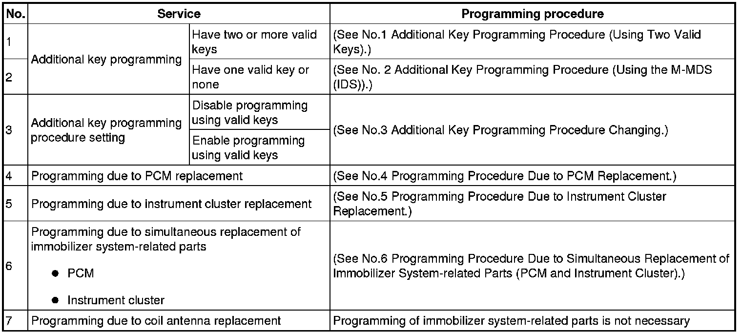 Immobilizer System-Related Parts Service and Programming Procedure Table