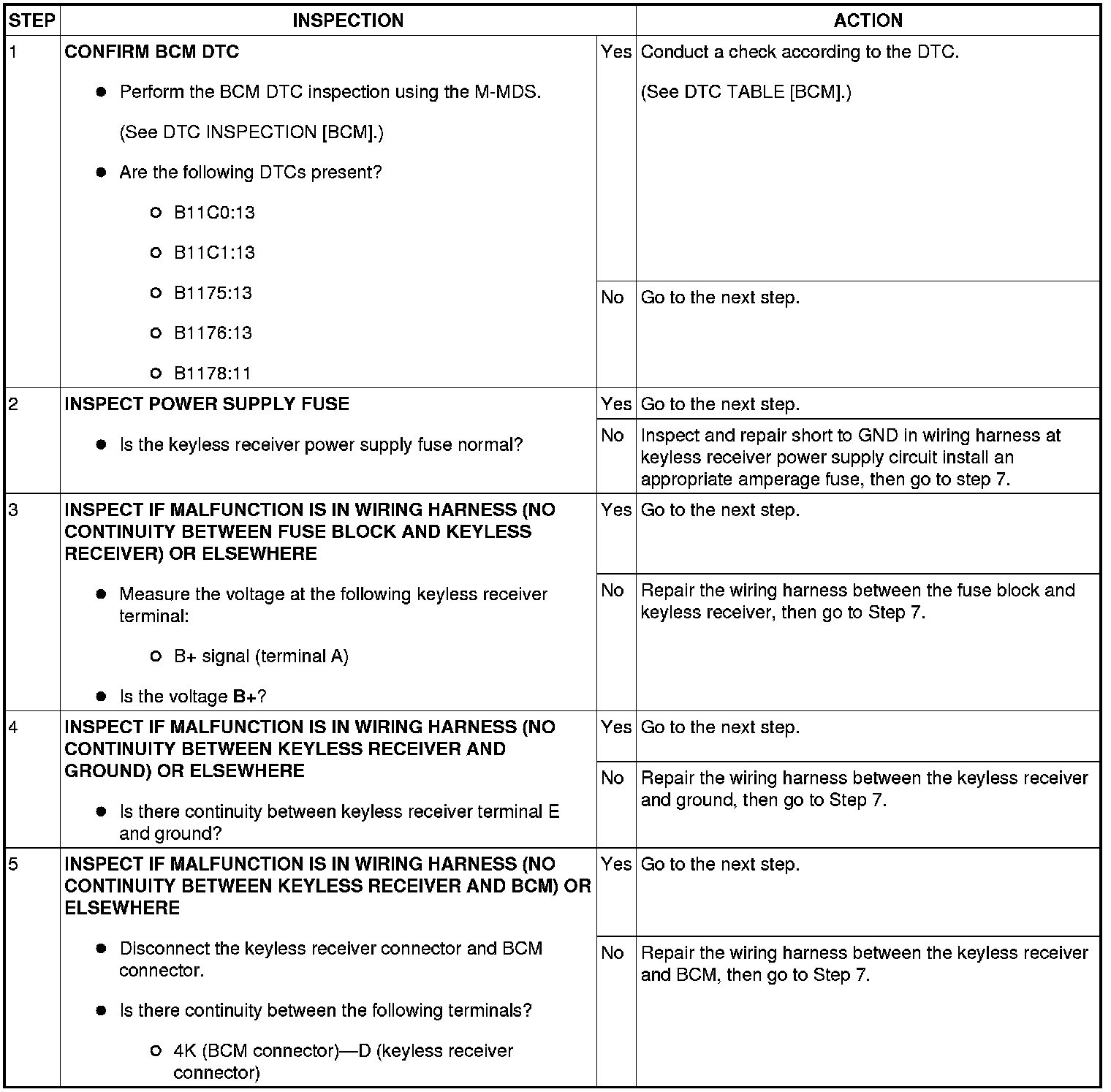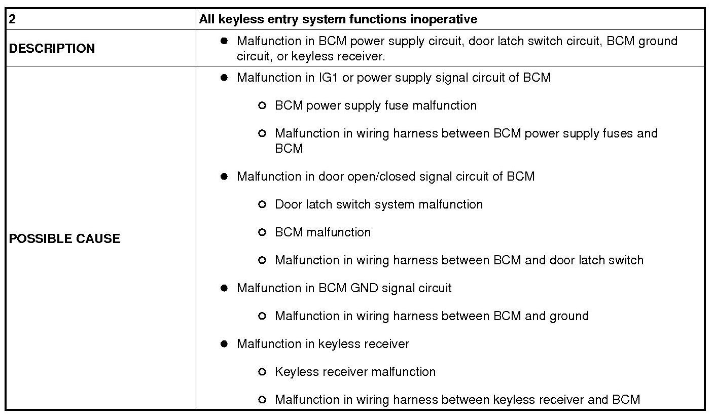Home >> Mazda >> 2012 >> Mazdaspeed3 L4-2.3L Turbo >> Repair and Diagnosis >> Body and Frame >> Locks >> Keyless Entry >> Testing and Inspection >> Symptom Related Diagnostic Procedures >> Keyless Entry System >> No. 2 All Keyless Entry System Functions Inoperative