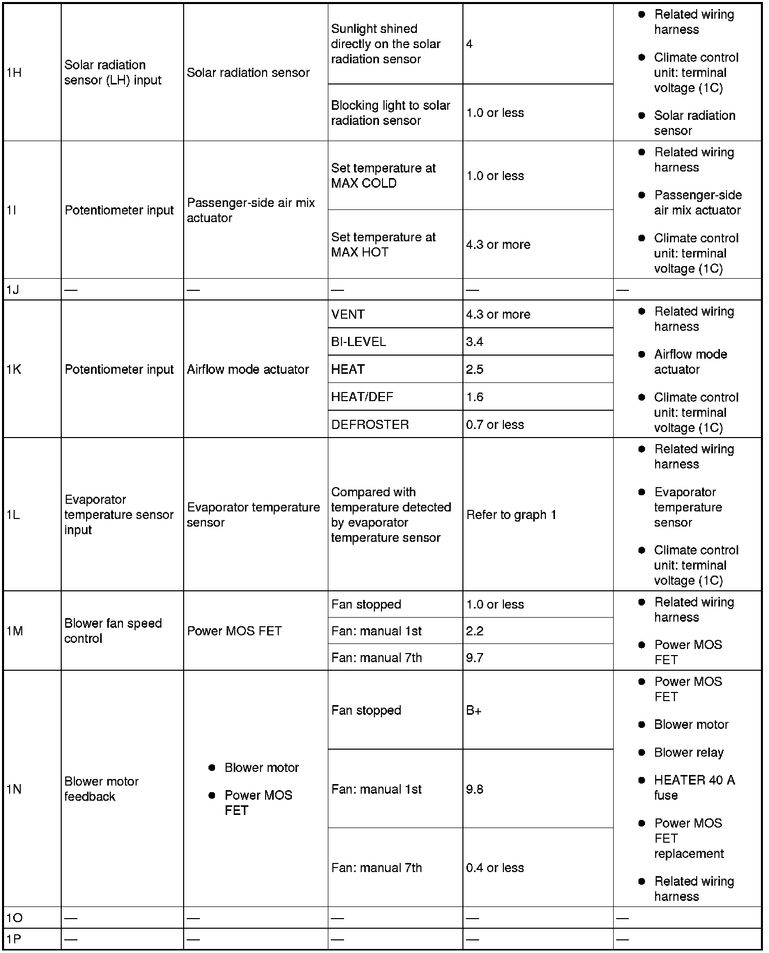 - If the parts under "Inspection item (s)" are found to be normal (except for terminal 1M), replace the climate control unit.