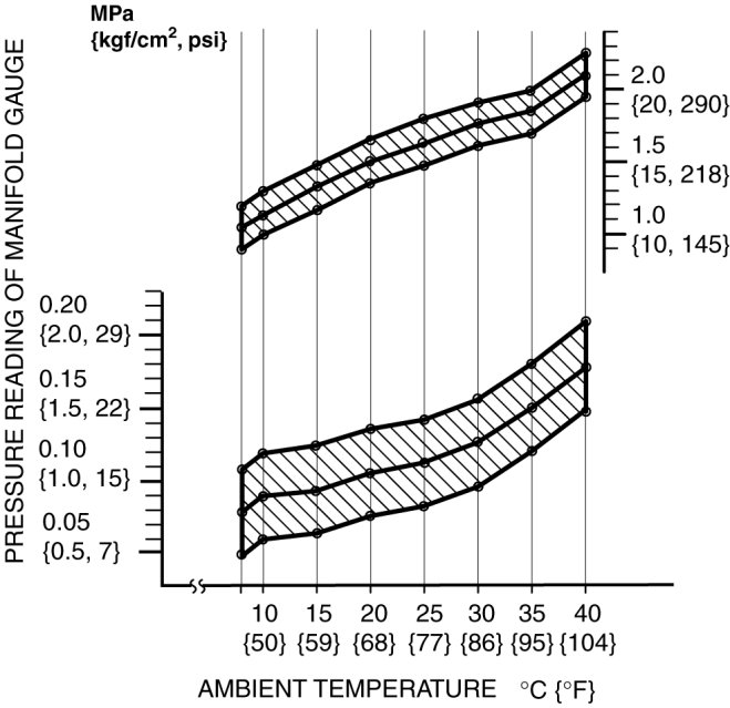 10. Verify that the intersection of the pressure reading of the manifold gauge and ambient temperature is in the shaded zone.