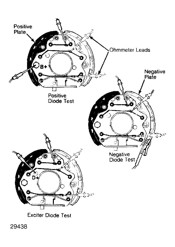 - Connect ohmmeter leads across negative plate and 3 stator terminals one at a time. See Fig 1. Reverse leads. Ohmmeter should indicate continuity in one direction only.