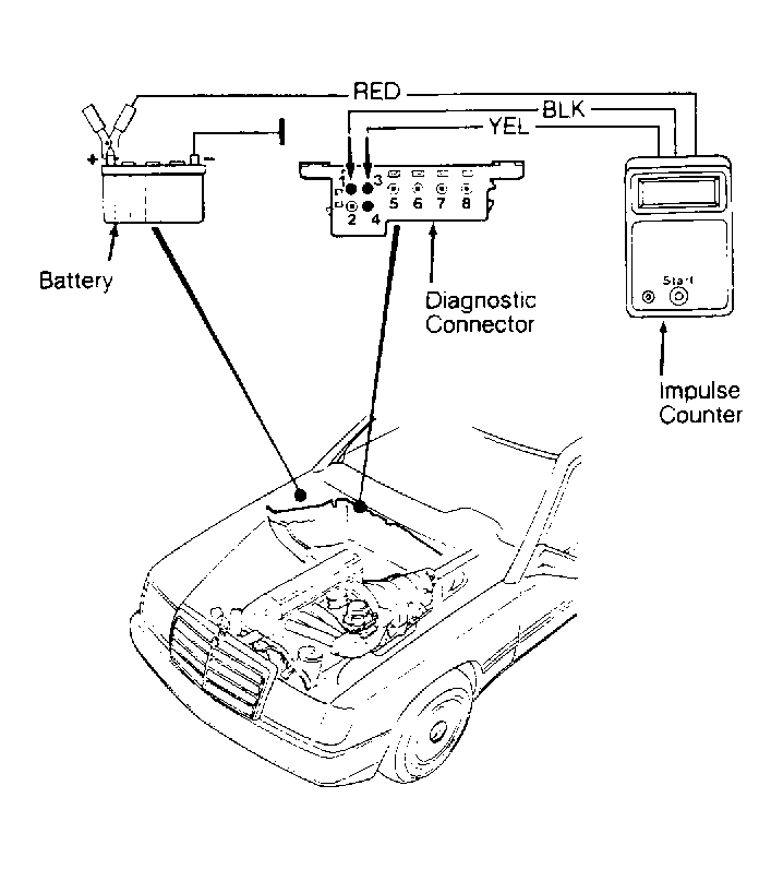 An on-board test connection with push button and light emitting diodes is located on left, rear engine compartment firewall. See Fig 1 . To enter self-diagnostics, turn ignition on and press diagnostic connector push button No. 2, for 2-4 seconds. See Fig 1 and Figure . Impulse readout will commence flashing code sequence. Codes may also be retrieved through use of an impulse counter.