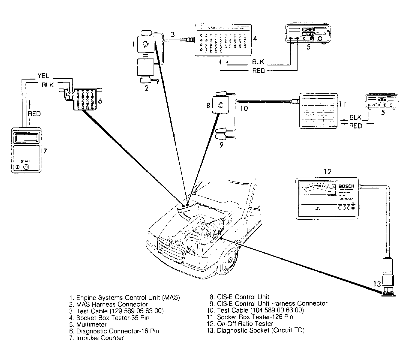 - Connect On-Off Ratio Tester (Bosch KDJE-P 600) to diagnostic socket (Circuit TD, located on left side of engine compartment). See Figure