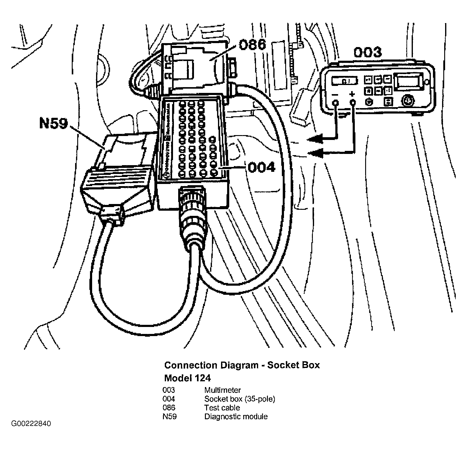 - With ignition Off, remove base module (N16/1) and connect socket box with contact module 1 and contact box. See Fig 1 and Fig 2 .