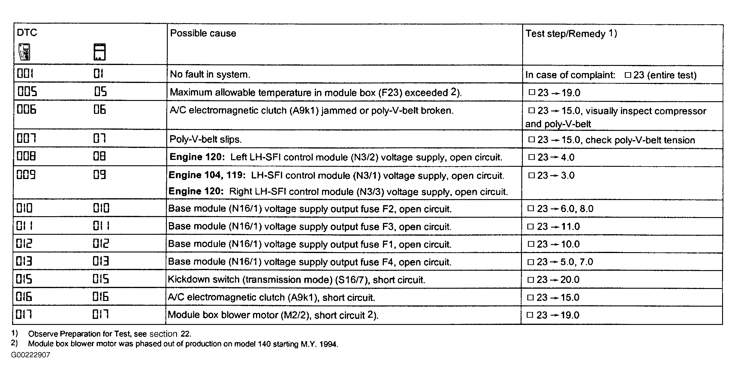 In Fig 1 the 1 and 2 digit codes in the left hand column are for generic scan tools. The 3 digit codes starting with zero or 1 are read from the Mercedes-Benz factory scan tool. See BASE MODULE TROUBLE CODE REFERENCE CHART (SECTION 11) .