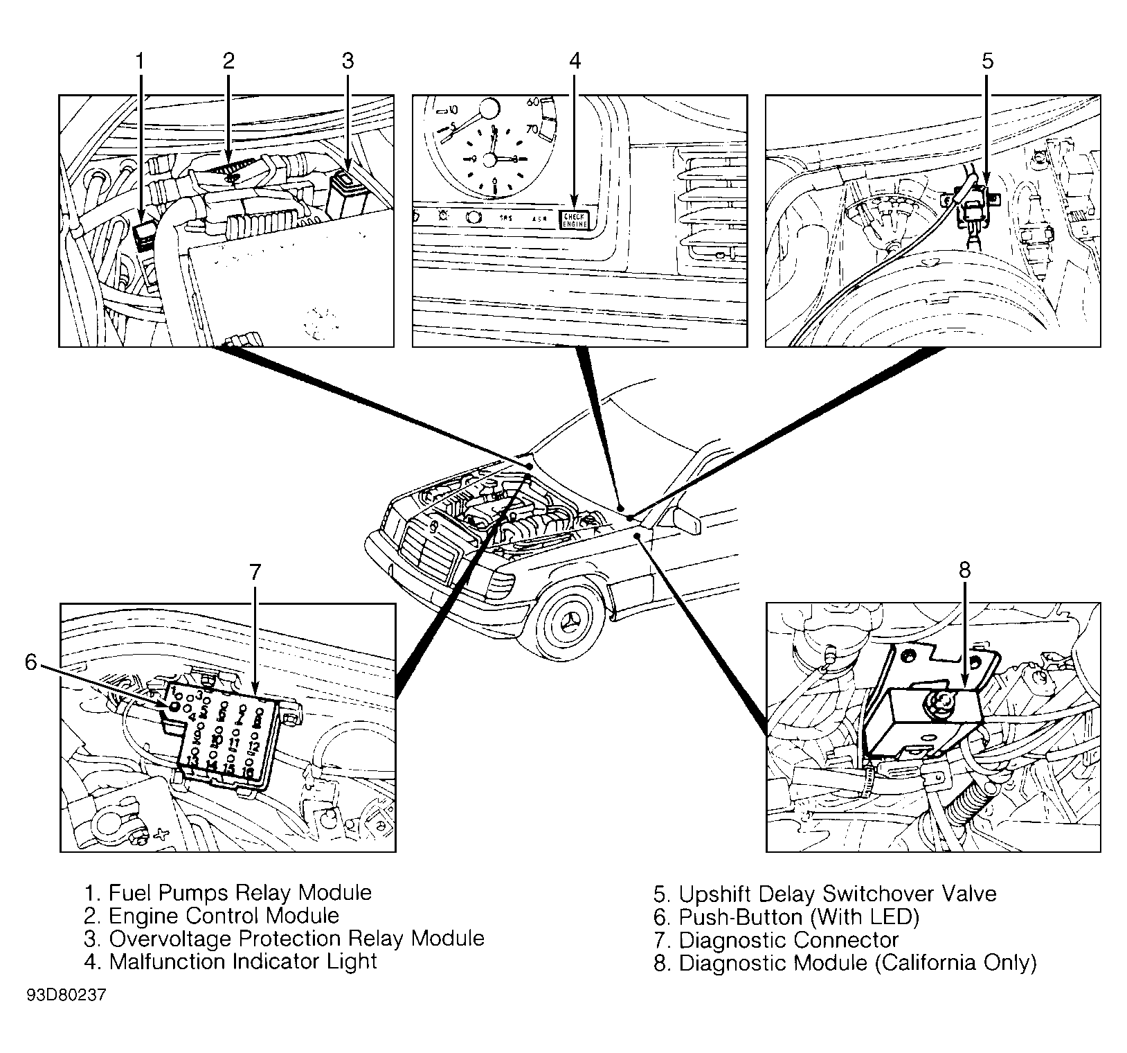 The engine control module is located in right rear corner of engine compartment in component compartment. See Figure . Voltage is supplied to engine control module from overvoltage protection relay. The engine control module receives engine operating information from sensors and controls fuel injection and ignition timing.
