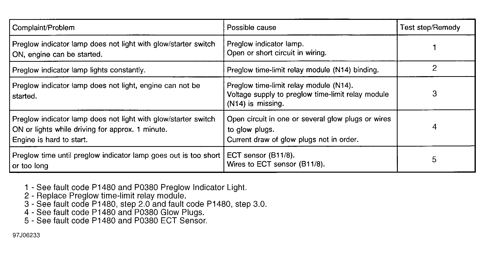 The preglow time-limit relay module has a short circuit protection feature. If a short occurs in glow plug wiring or glow plugs, current is interrupted. The preglow time-limit relay module is operational again if short is eliminated or glow/starter switch is turned to position "O". A malfunctioning glow plug will be identified by an illuminated preglow indicator light. For symptom diagnostic information relating to preglow system, See Fig 1.