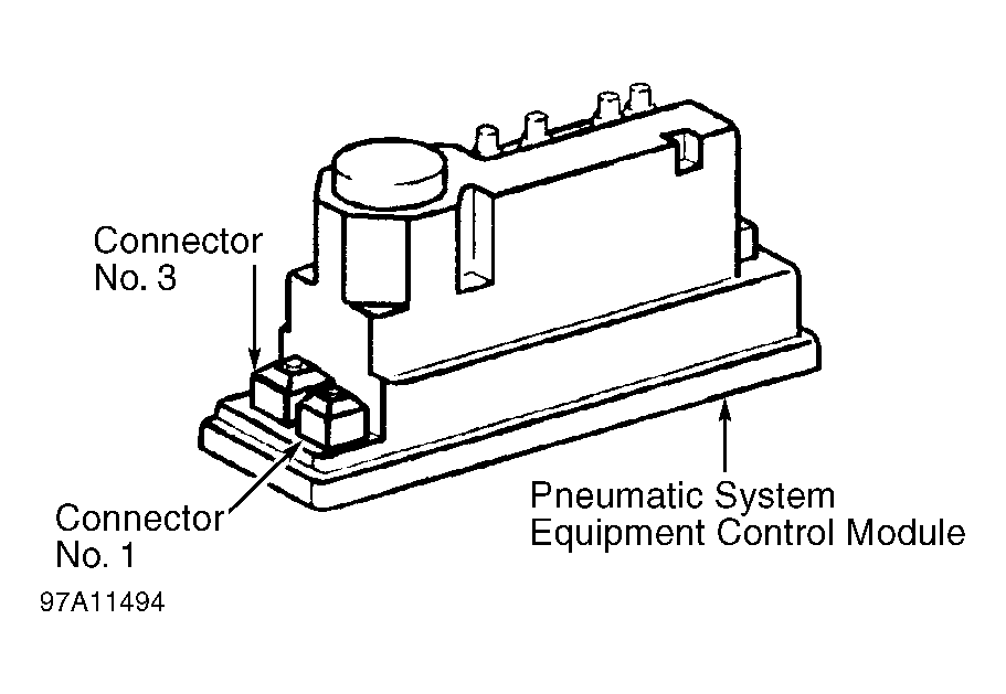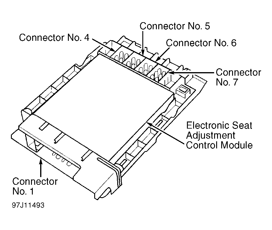 1. Turn ignition switch to LOCK position. Disconnect combination control module harness connector. Using Adapter Harness (210 589 01 63 00), connect Breakout Box (129 589 00 21 00) to combination control module harness connector. See Figure. Disconnect Pneumatic System Equipment (PSE) control module harness connectors No. 1 and 3. See Figure. Disconnect appropriate power seat control module harness connector No. 1. See Figure. Measure resistance between terminal No. 6 at power seat control module harness connector No. 1 and terminal No. 62 at breakout box. If resistance is one ohm or less, go to next step. If resistance is greater than one ohm, repair open in CAN L data line between power seat control module and combination control module. See WIRING DIAGRAMS .