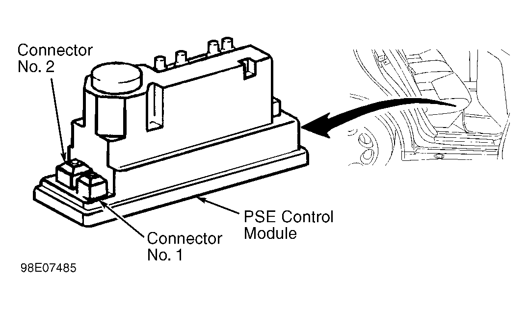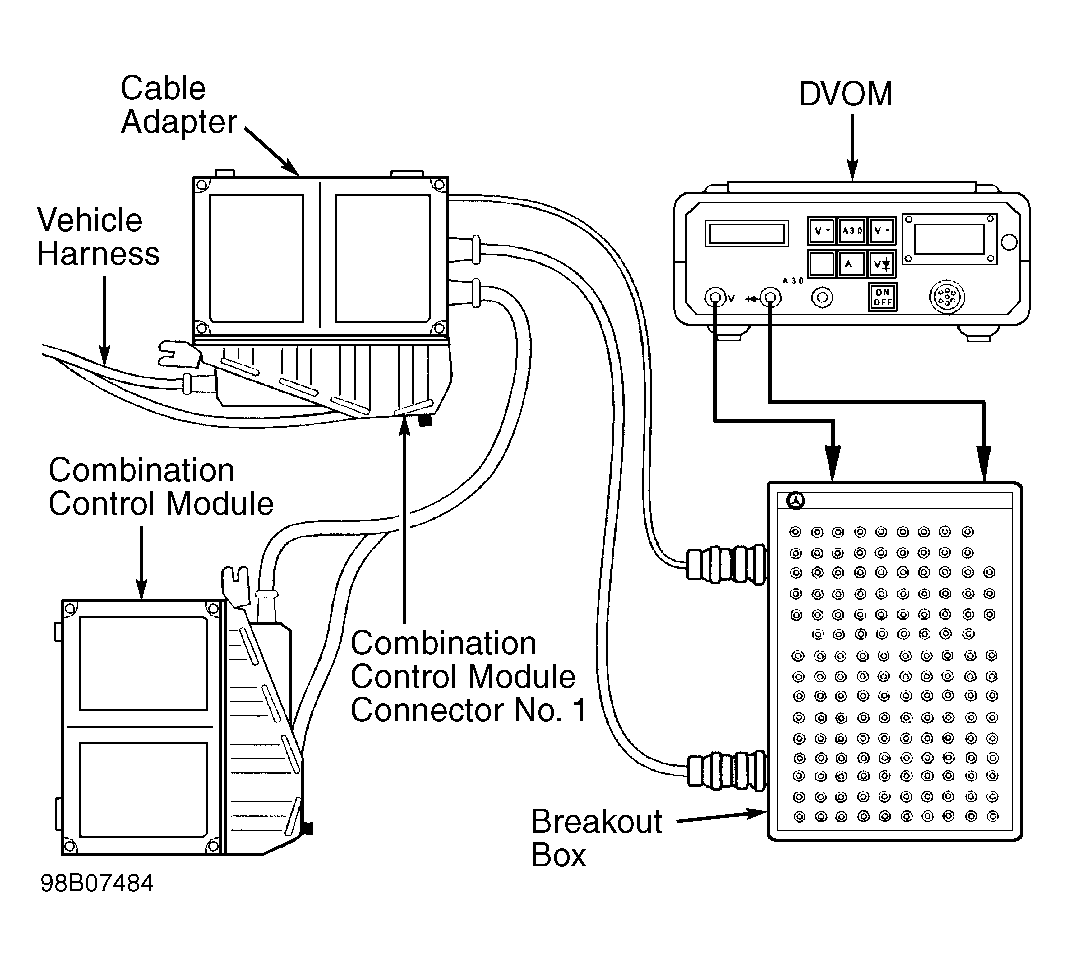 Using Adapter (140 589 12 63 00), connect Breakout Box (129 589 00 21 00) to combination control module. See Figure. With ignition switch in OFF position, disconnect combination control module connector "A". See Figure. Measure resistance between terminals No. 39 and 77 at breakout box. With switch at rest position, 20,000 ohms should exist. Press and hold switch to CLOSE position. About 200 ohms should exist. If resistance is not as specified, check wiring. See WIRING DIAGRAMS . If wiring is okay, check right front power window switch. Repair or replace as necessary.