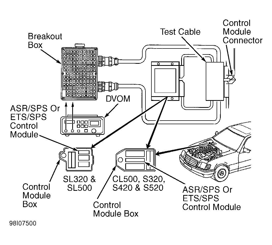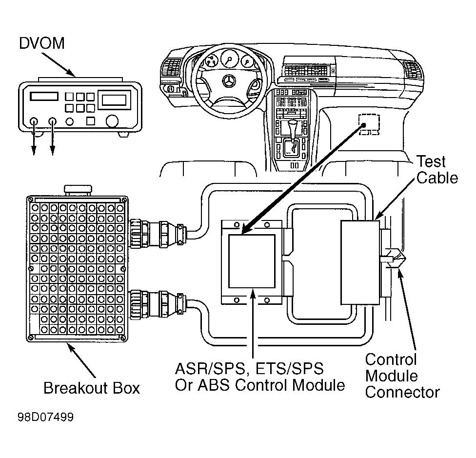 - Using Adapter (202 589 03 63 00), connect Breakout Box (129 589 00 21 00) to traction control module. See Figure, Figure or Figure. Raise and support front of vehicle. Turn ignition switch to RUN position. Check voltage between terminals No. 57 and 77 at breakout box while rotating left front tire by hand faster than one revolution per second. Greater than 3 volts (AC) should exist. If voltage is not as specified, check wiring. See WIRING DIAGRAMS . If wiring is okay, go to next step.