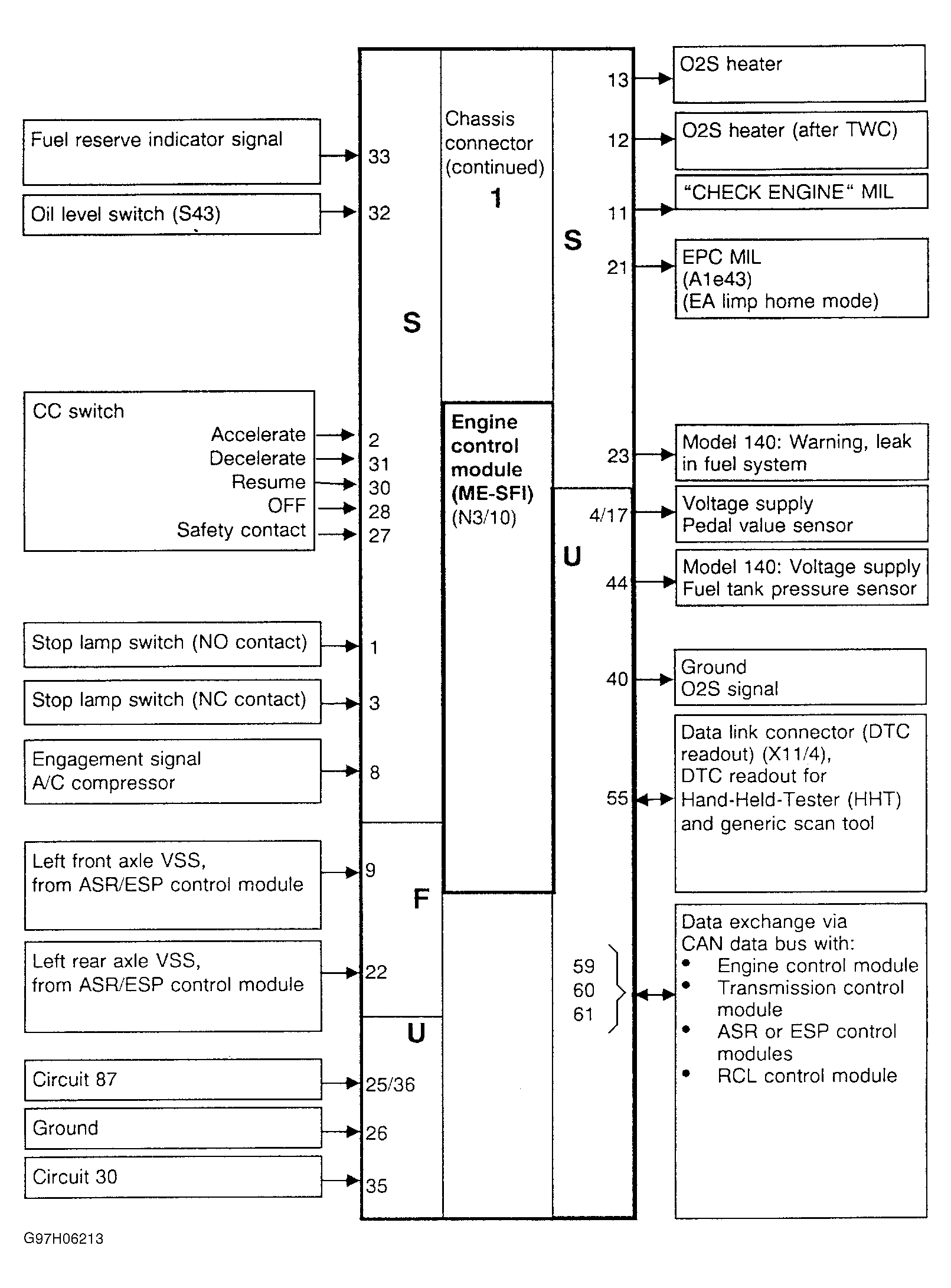 The Motor Electronics Sequential Fuel Injection (ME-SFI) system consists of activated charcoal canister shut-off valve, adjustable camshaft timing solenoid, AIR pump, AIR pump switchover valve, Base Module (BM), body acceleration sensor, camshaft hall-effect sensor, Crankshaft Position (CKP) sensor, Electronic Accelerator/Cruise Control/Idle Speed Control (EA/CC/ISC) actuator, Engine Control Module (ECM), Engine Coolant Temperature (ECT) sensor, fuel injectors, fuel tank pressure sensor, hot film mass airflow sensor, Intake Air Temperature (IAT) sensor, ignition coils, intake manifold pressure sensor, Knock Sensor (left and right side), oil level switch, Oxygen Sensor (O2S) (downstream), Oxygen Sensor (O2S) (upstream), pedal value sensor, purge control valve, purge monitoring pressure sensor, and Transmission Control Module (TCM). See Fig 1 -Fig 2 .