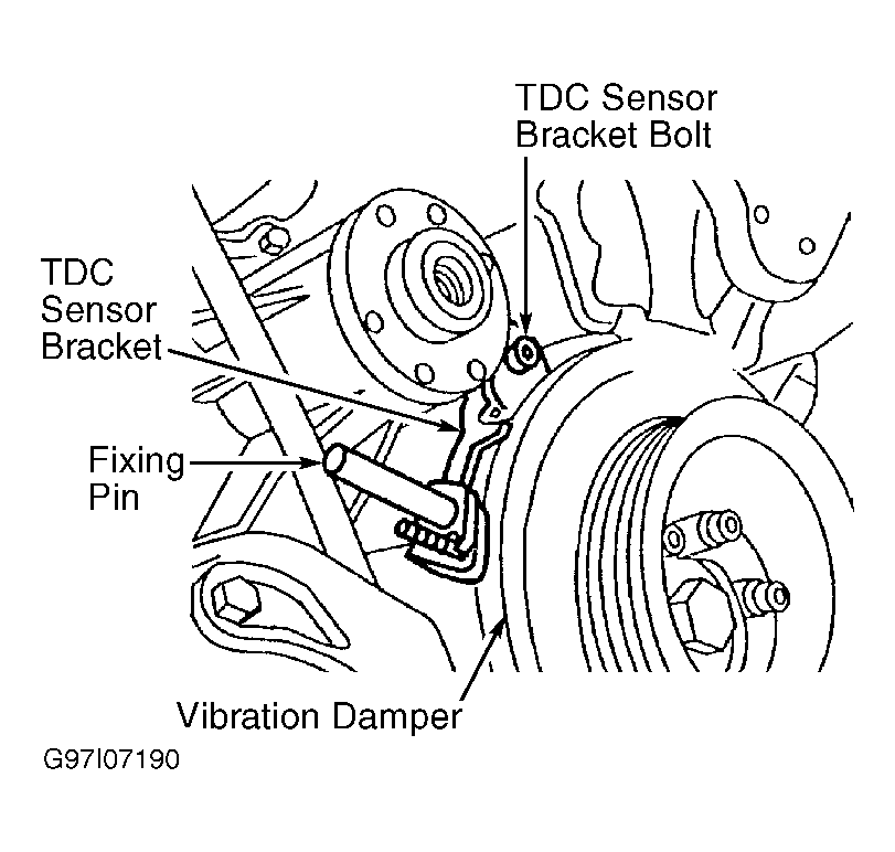 - If fixing pin engages vibration damper, TDC sensor bracket adjustment is okay. If fixing pin does not engage vibration damper, loosen TDC sensor bracket bolt and adjust until fixing pin engages vibration damper. See Fig 2