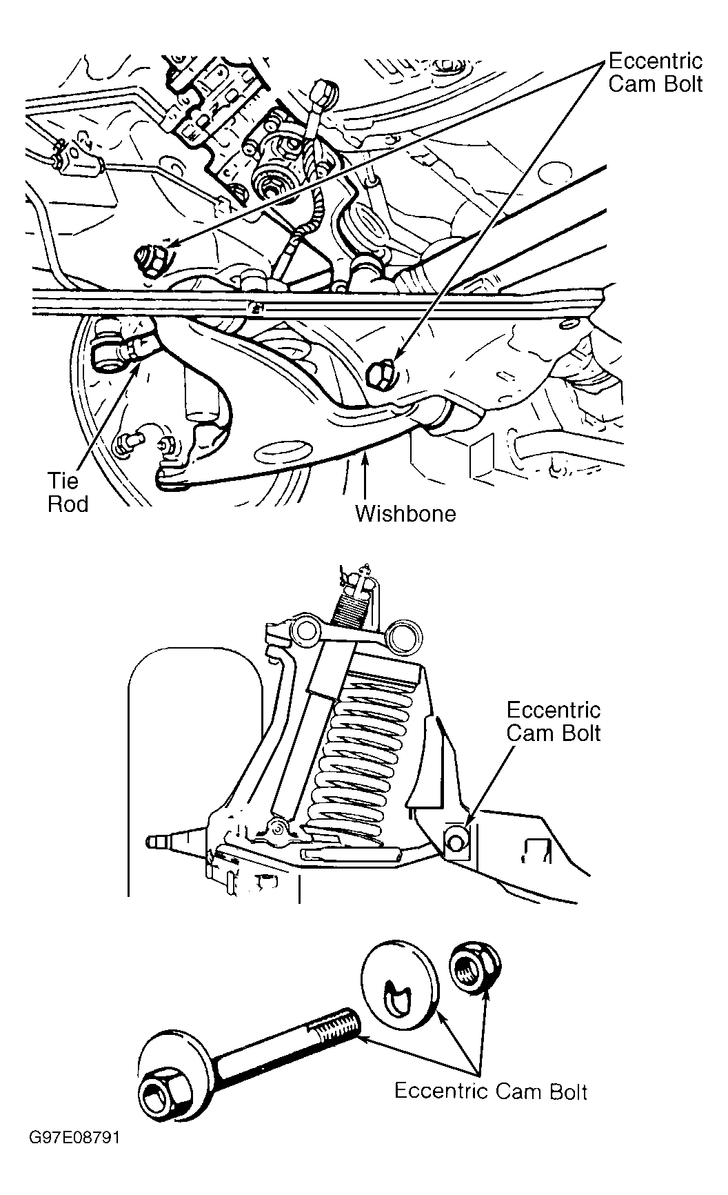 - Loosen hex nuts on lower wishbone mount to adjust camber (front eccentric bolt) and caster (rear eccentric bolt). When tightening hex nuts, after adjustment, hold eccentric bolts. Tighten nuts to specification. See TORQUE SPECIFICATIONS .
