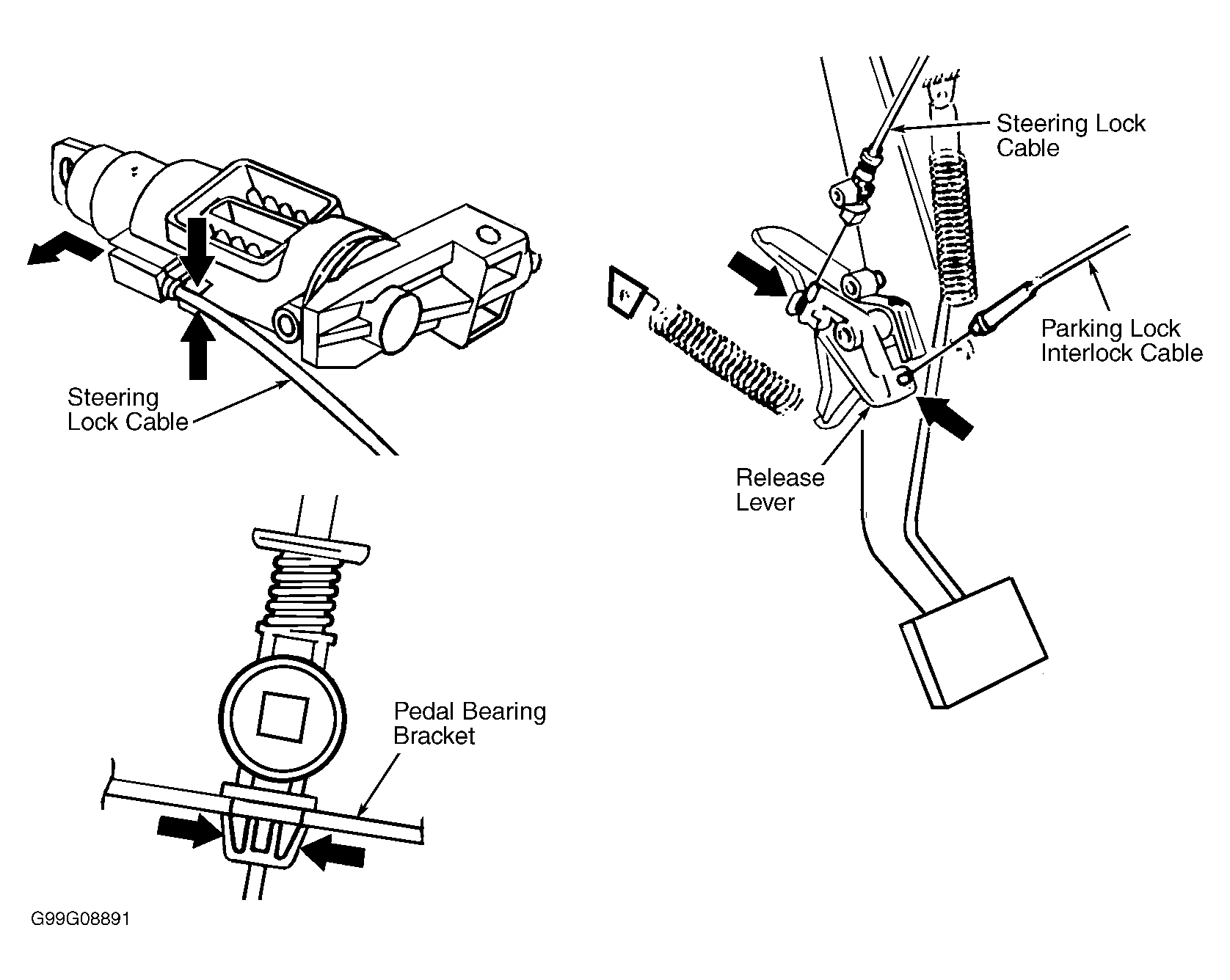 Remove cover below left side of instrument panel. Unhook cable from steering lock by pressing in locking tongues and pressing in against steering lock. See Figure . Remove stoplamp switch and unhook steering lock cable from release lever. Compress locking device and push steering lock cable upwards and out of pedal bearing bracket. Remove steering lock cable. To install, reverse removal procedure.