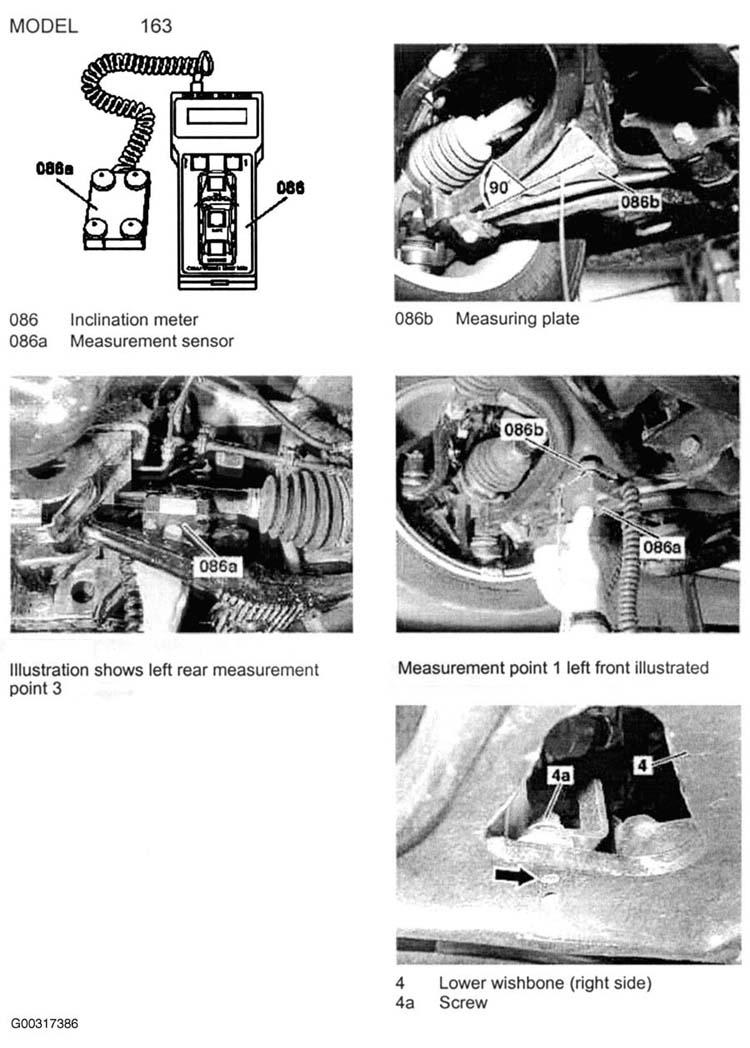 On this vehicle chassis an electronic inclination measuring instrument (CM-9606) must be used to measure front and rear vehicle level (riding height). See Fig 1 and Figure . It is necessary to check vehicle riding height using a servicing pit or alignment rack. Vehicle weight must be on wheels. See instrument manufacturer for tool usage.