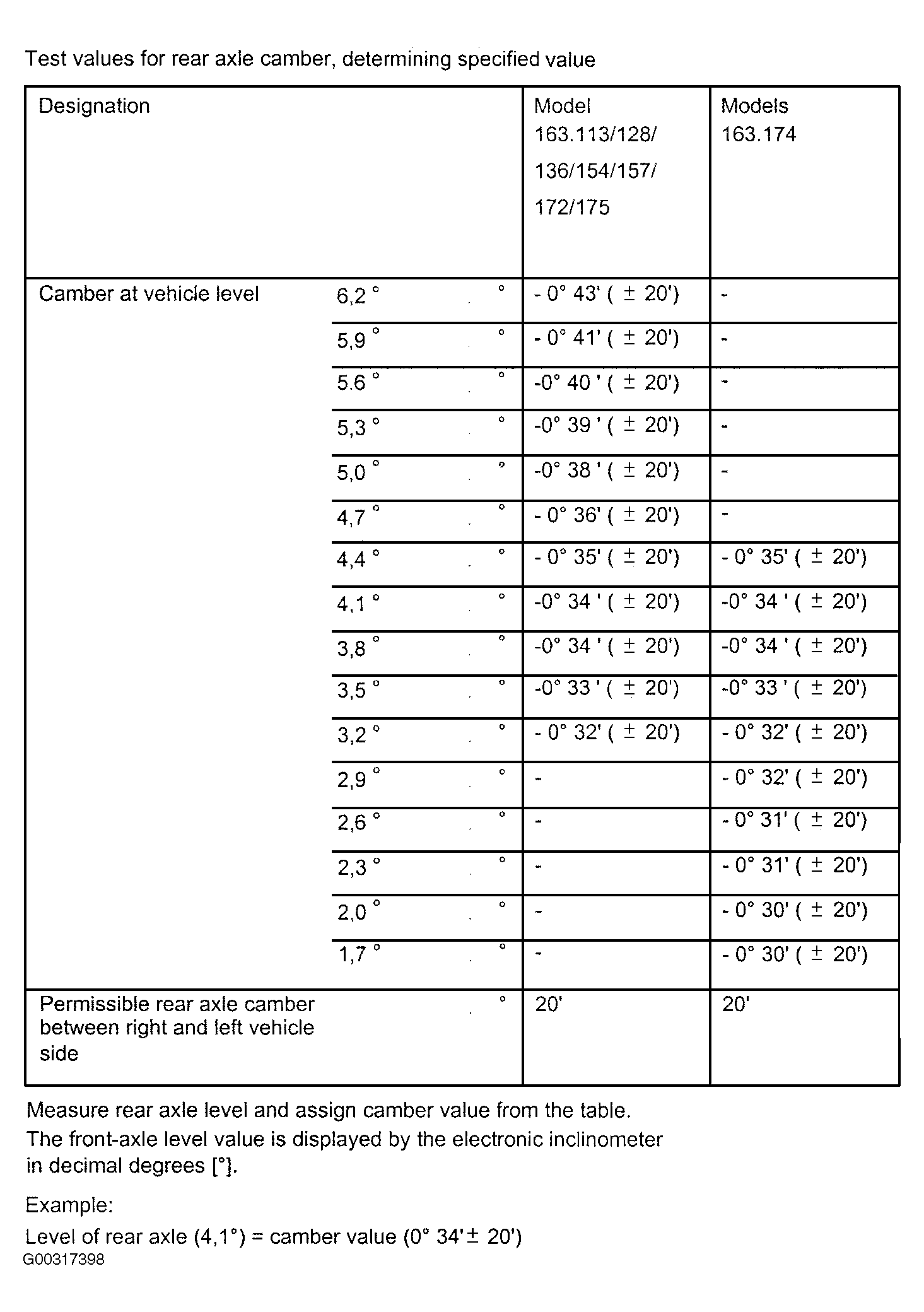 | Rear Axle Toe-In | 0° 20' | +/-7' | ||||||||||