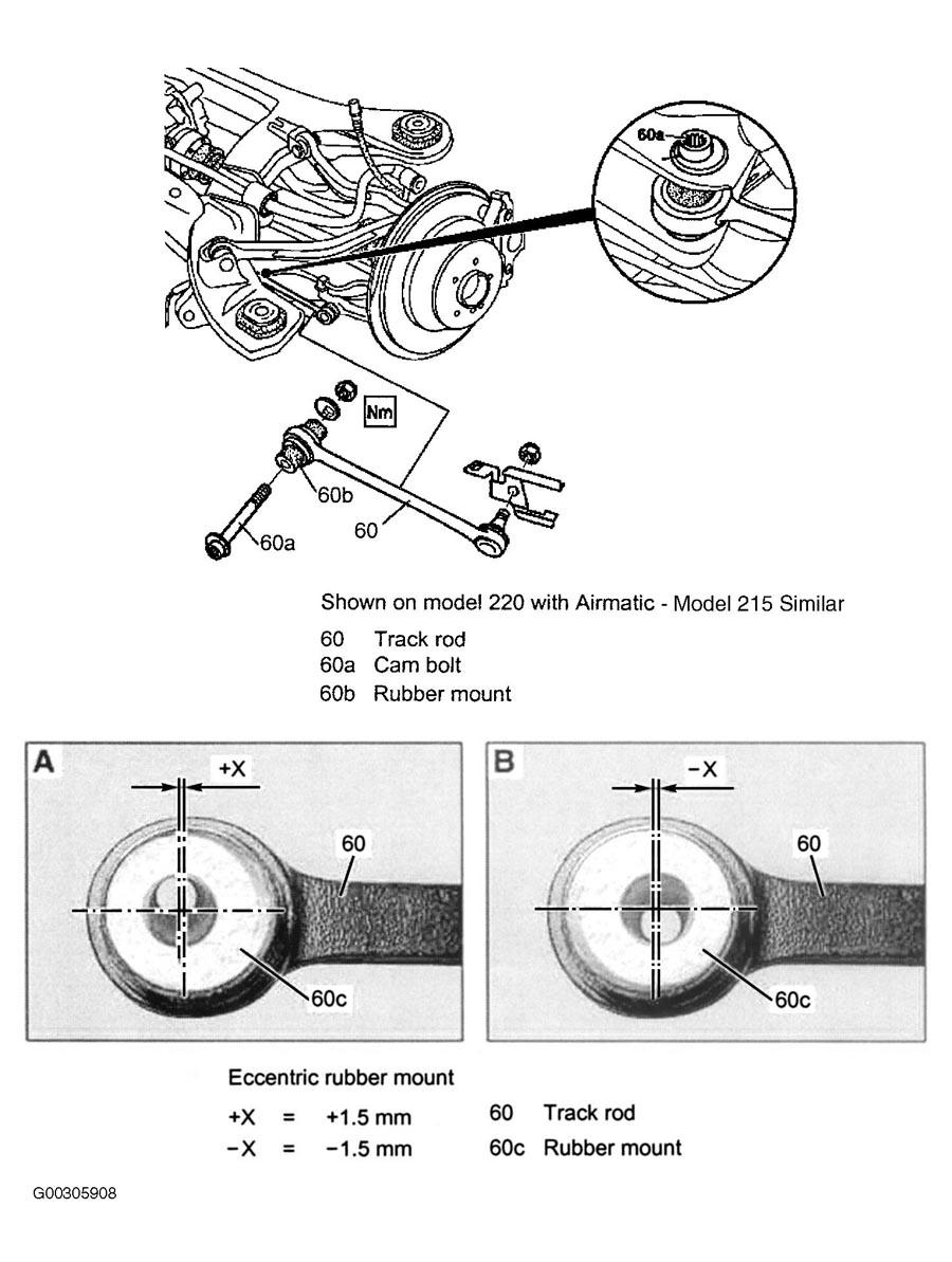 - Adjust toe-in with cam bolt (60a) at the mount of the tie rod (60) at rear axle carrier. See Fig 1