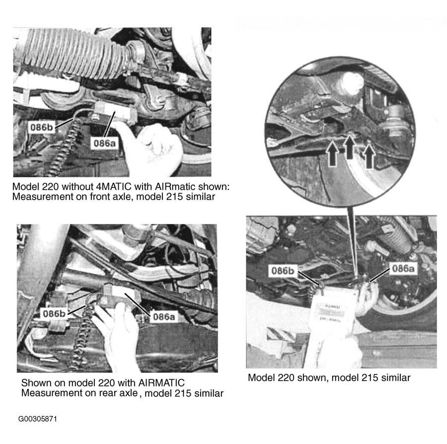 215 chassis vehicles require the use of electronic inclination measuring instrument (CM-9606) to measure front and rear vehicle level (riding height). See Fig 1 and Figure . Vehicles with Active Body Control (ABC) requires the use of Mercedes-Benz "STAR DIAGNOSIS" compact PC (6511 1801 00). It is necessary to check vehicle riding height using a servicing pit or alignment rack. Vehicle weight must be on wheels. See instrument(s) manufacturer for tool usage.