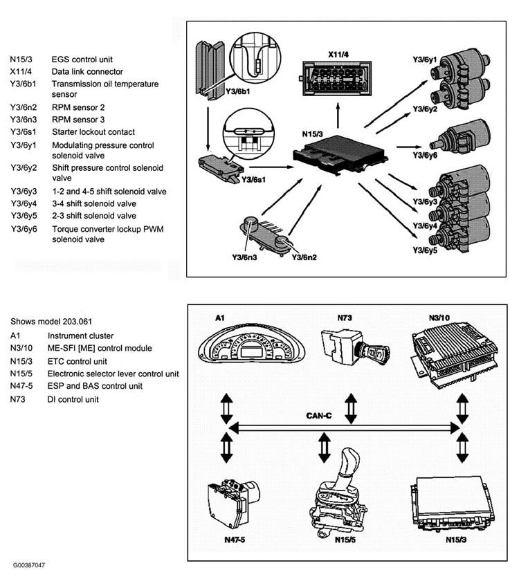 The ETC [EGS] control unit takes over the actuation of the solenoid valves for modulating and shift pressure and for shifting gears (N15/3).
