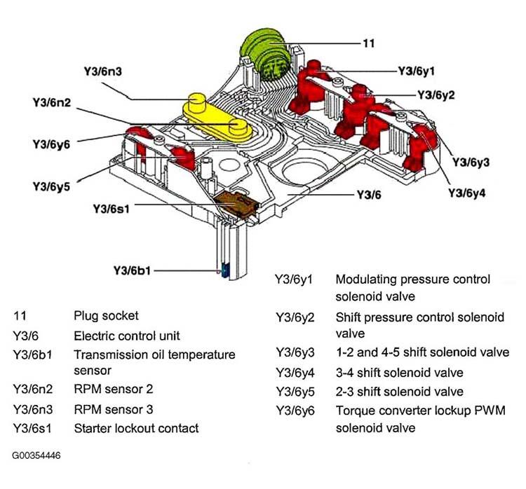The electrical control unit (Y3/6) consists of a supporting body made from plastic, in which the electrical components, RPM sensors 2 and 3 (Y3/6n2, Y3/6n3), the regulating solenoid valves (Y3/6y1, Y3/6y2), the shift solenoid valves (Y3/6y3, Y3/6y4, Y3/6y5), the PWM convertor lockup solenoid valve (Y3/6y6), the starter lockout contact (Y3/6s1) and transmission oil temperature sensor (Y3/6b1) are combined. See Fig 1.