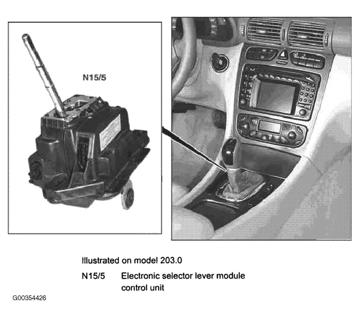The control unit for the electronic selector lever module (N15/5) is located in the center console of the vehicle. See Fig 1. - Control Unit For Electronic Selector Module, Task